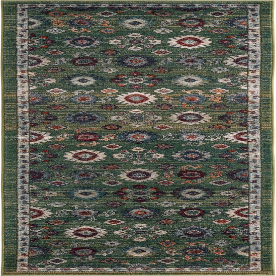 Primary color is Fern Green. Colors in this rug include: Fern Green, Beige, Black, Blue, Green, Ivory, Light Blue, Light Green, Navy Blue, Orange, Purple, Red.
