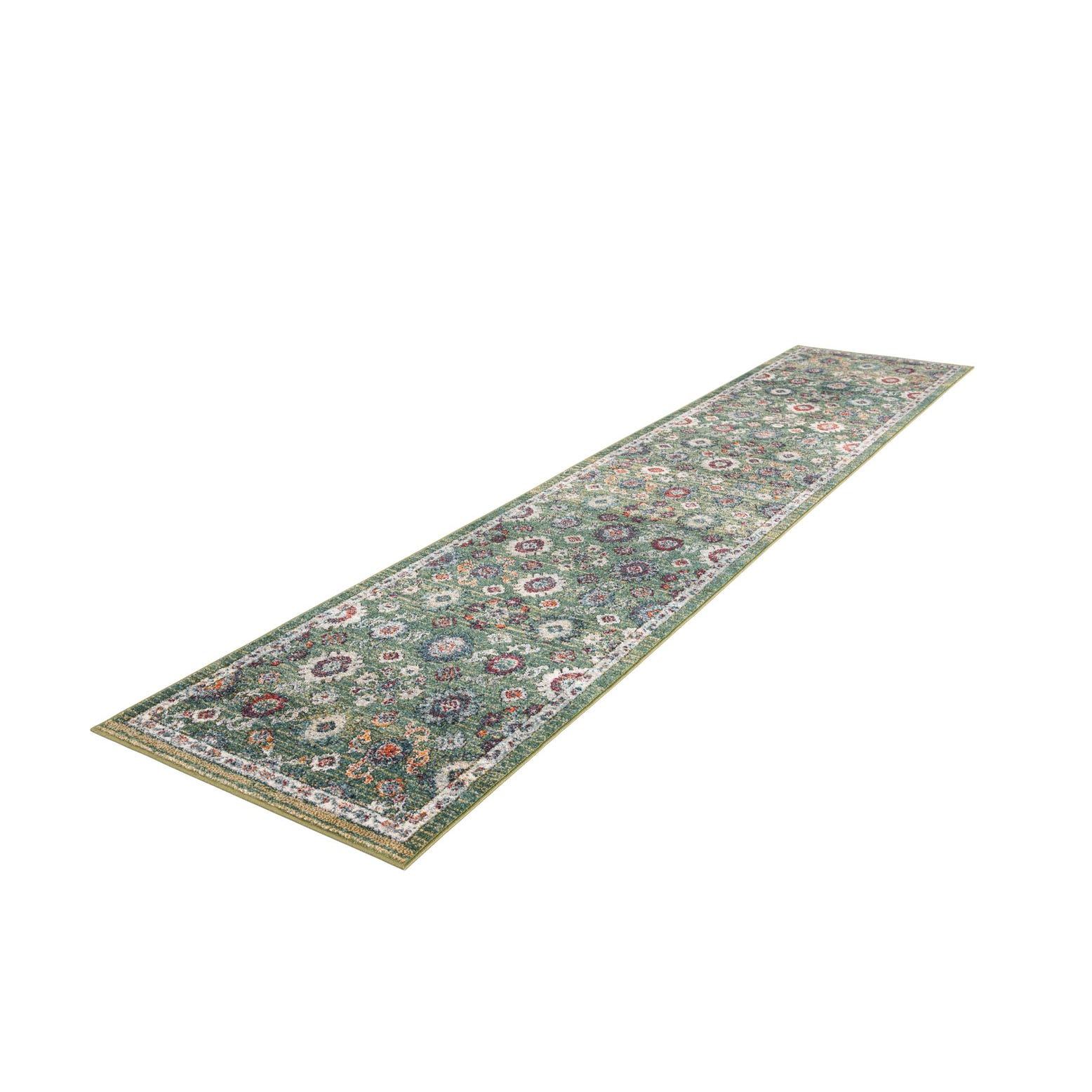 A long 13 ft runner rug in shades of green with an ornate, distressed traditional pattern featuring red, blue, and cream accents.