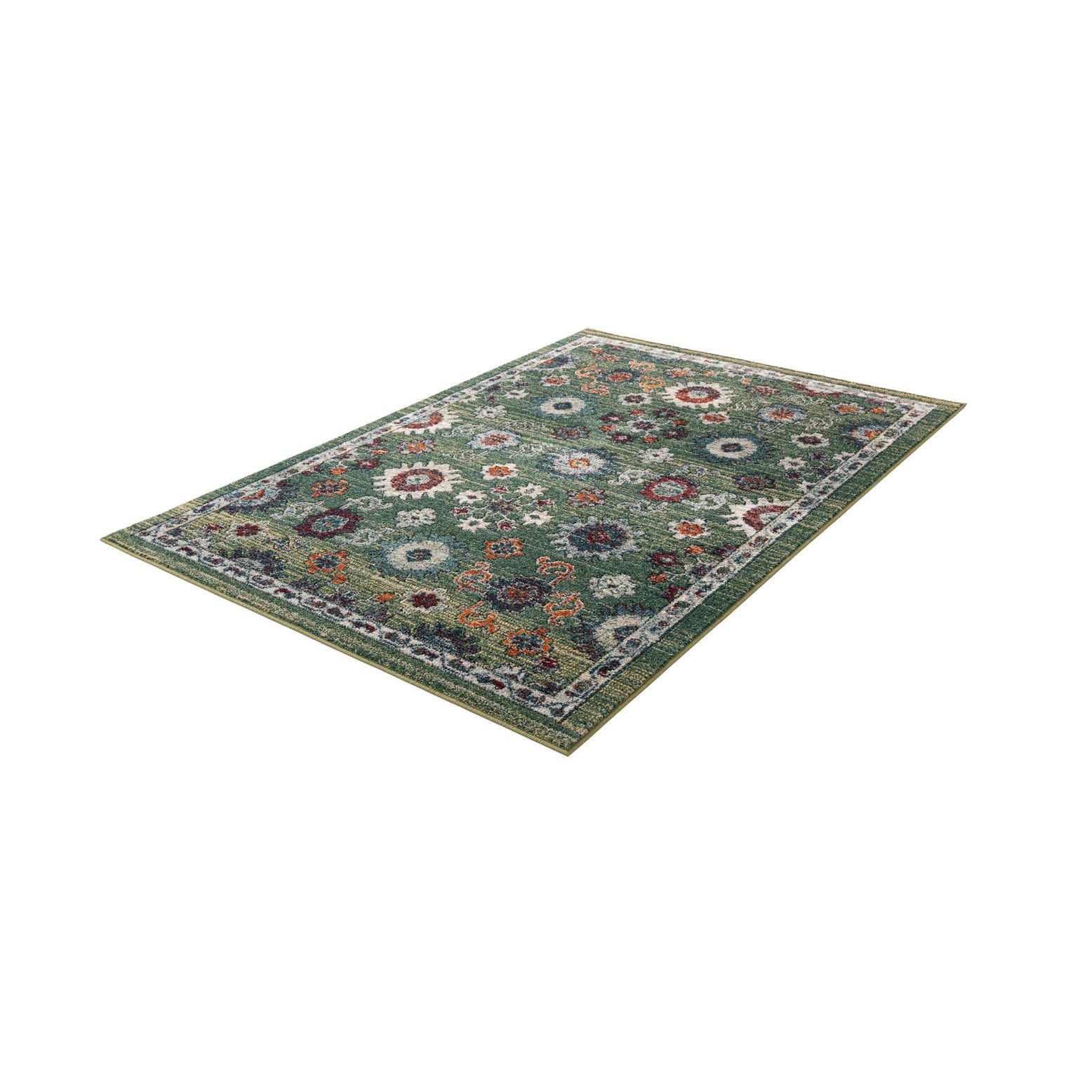 A 4x6 rectangular green area rug with a distressed floral medallion pattern in shades of red, blue, orange, and cream, featuring a decorative border.