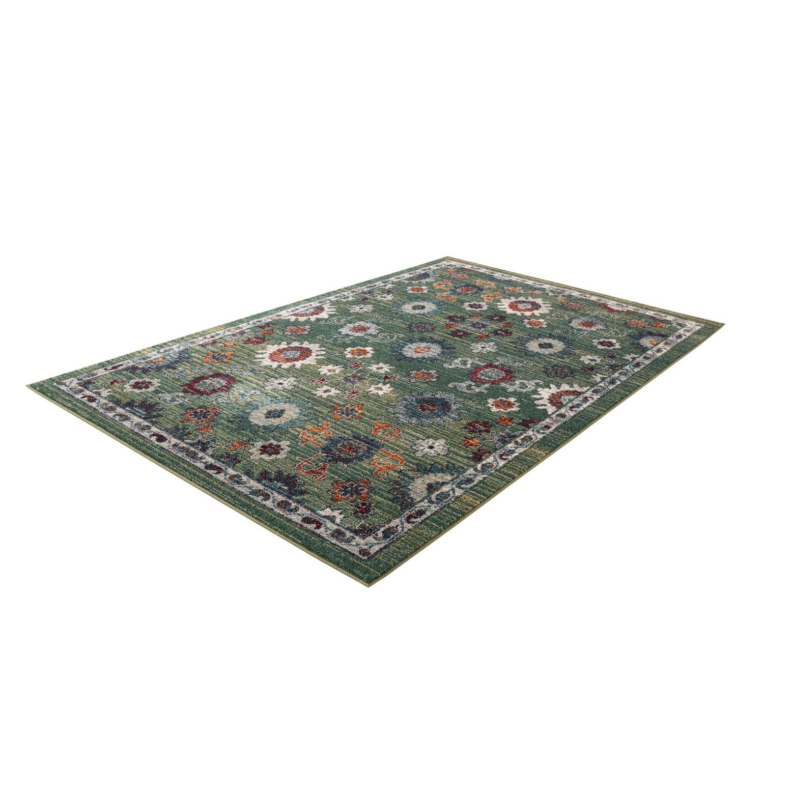 A 5x8 rectangular green area rug with a distressed traditional floral pattern in shades of cream, red, orange, and blue.