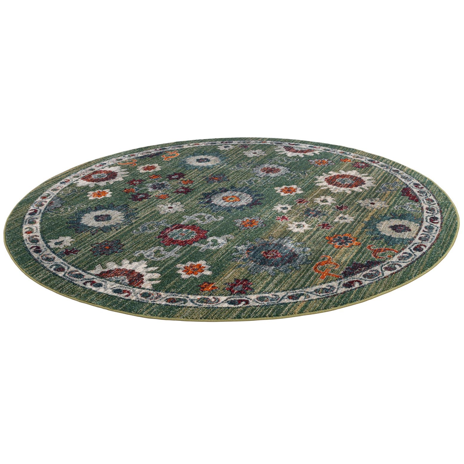 A round green vintage rug with an intricate floral and medallion pattern in shades of red, blue, orange, and cream.