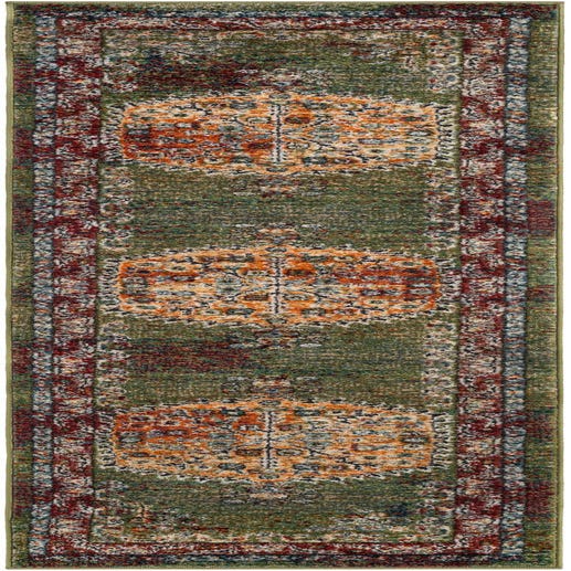 Primary color is Fern Green. Colors in this rug include: Fern Green, Beige, Blue, Hunter Green, Ivory, Light Blue, Navy Blue, Orange, Peach, Plum Red, Purple, Red.