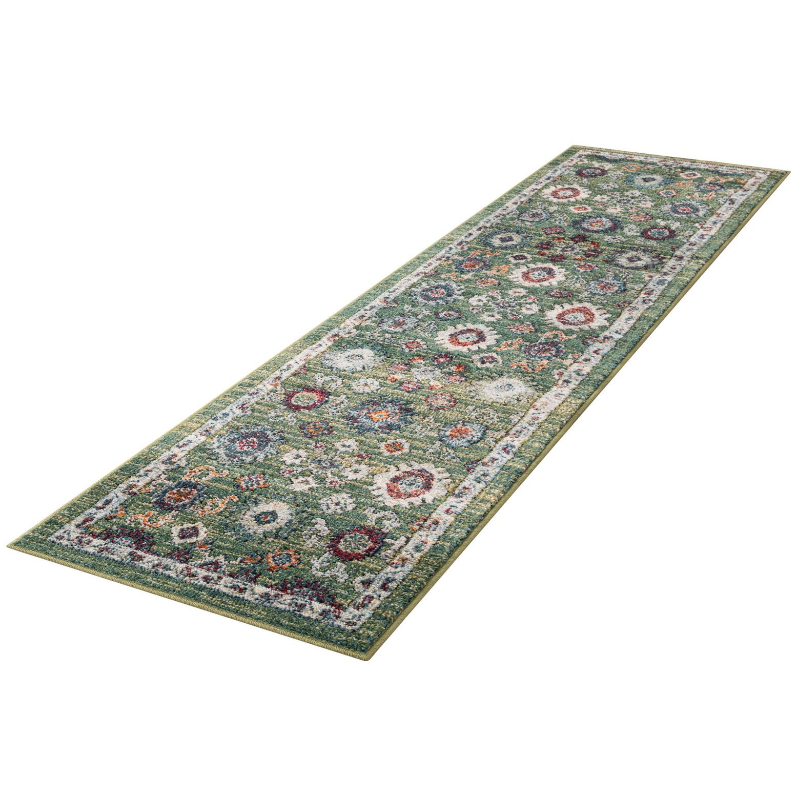 A long 8 ft runner rug featuring a distressed green background with a repeating pattern of white, red, and blue floral medallions and accents, ideal for a hallway.