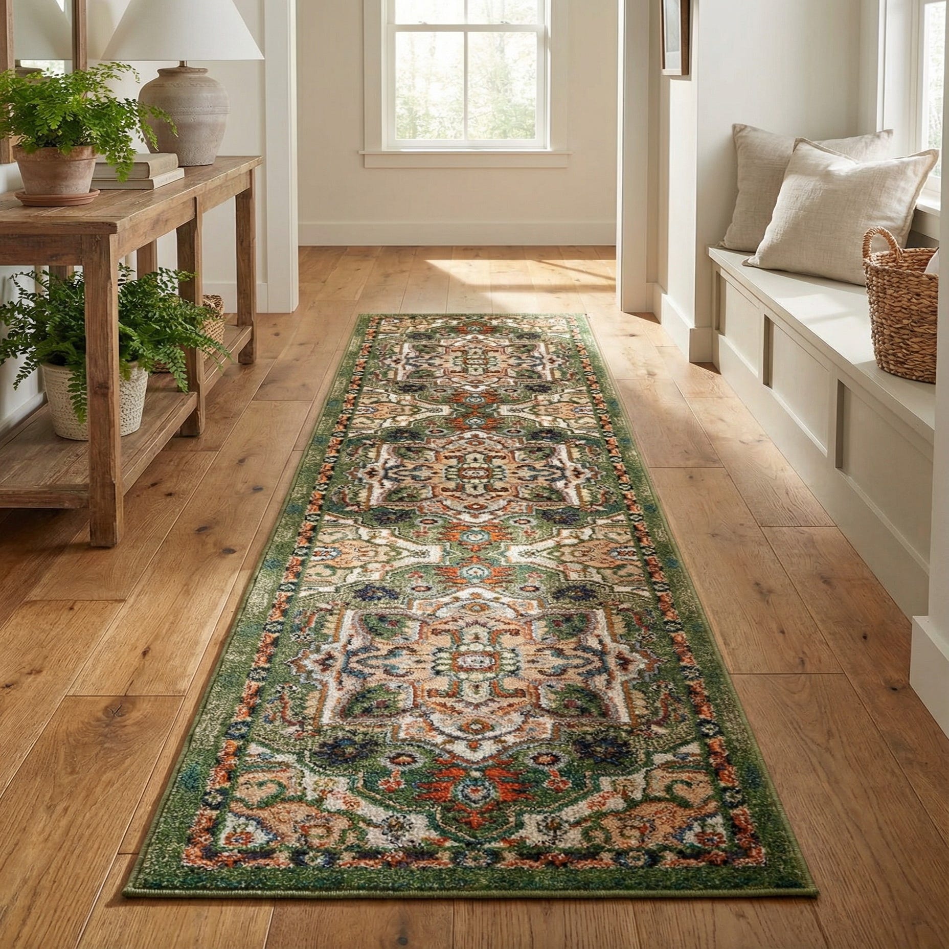 Primary color is Fern Green. Colors in this rug include: Fern Green, Beige, Blue, Gray, Hunter Green, Ivory, Light Blue, Navy Blue, Orange, Red, Purple, Plum Red, Peach.
