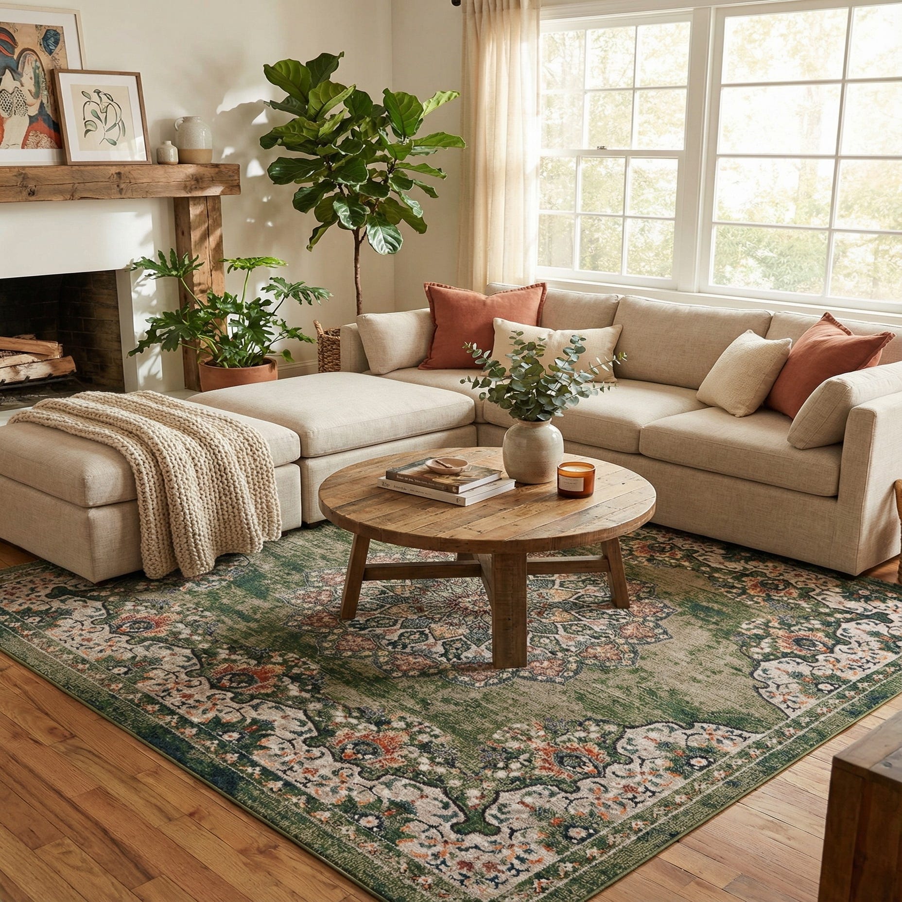 A square 8' x 8' Isabella collection rug featuring a distressed green background with a detailed traditional medallion and ornate border in cream, rust, and blue.