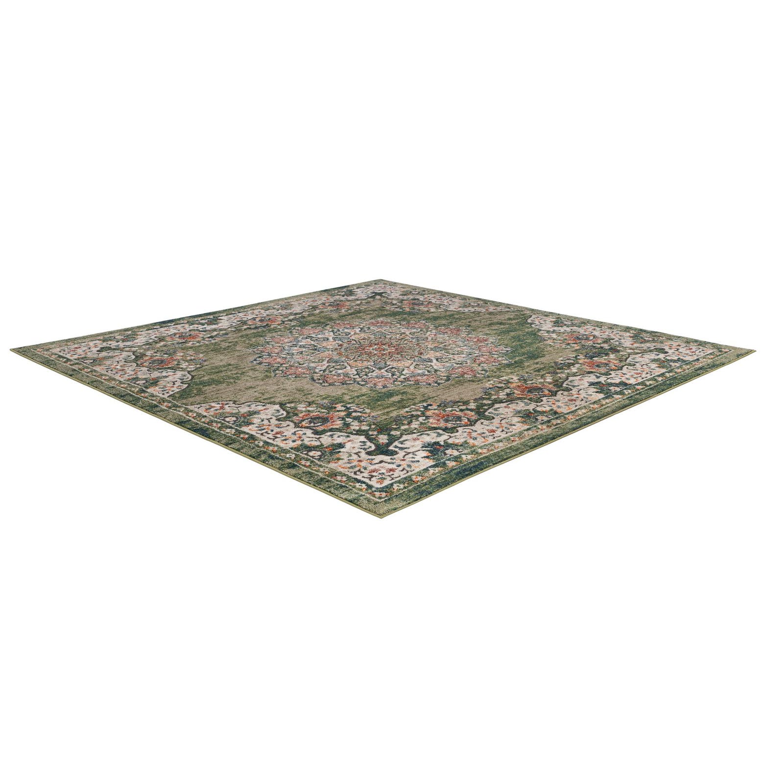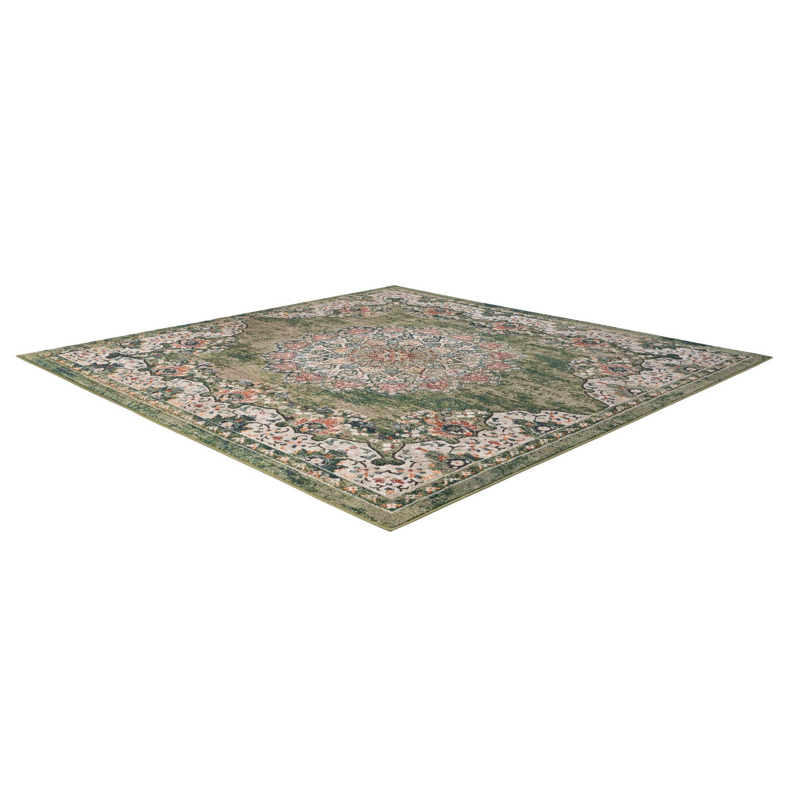 A square 8' x 8' Isabella collection rug featuring a distressed green background with a detailed traditional medallion and ornate border in cream, rust, and blue.