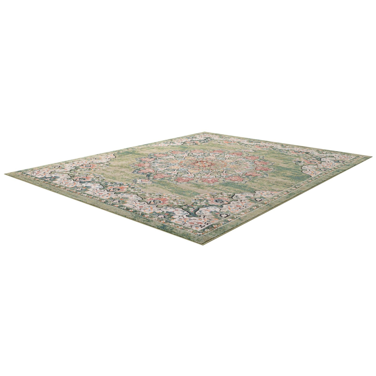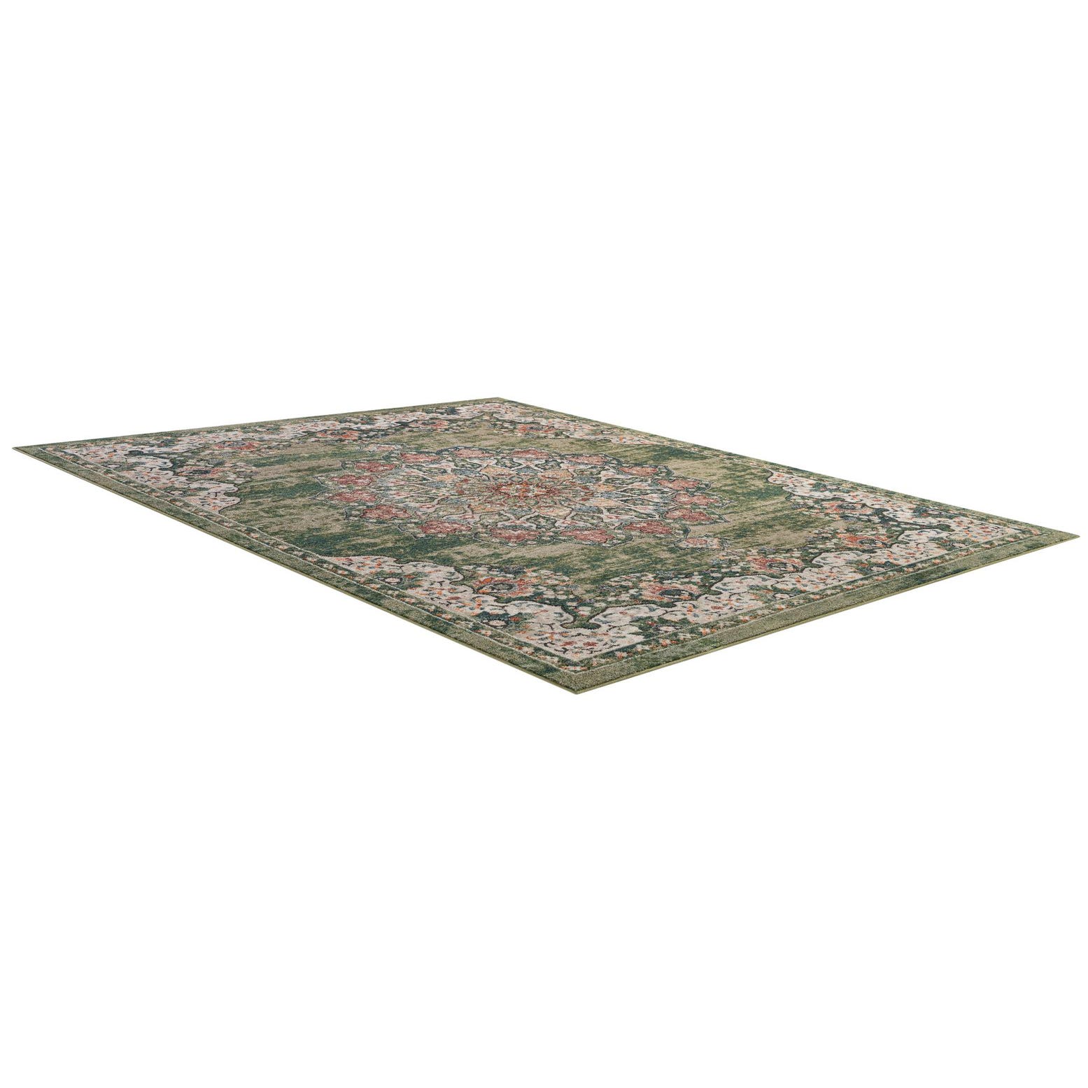 Primary color is Fern Green. Colors in this rug include: Fern Green, Beige, Black, Blue, Brown, Green, Ivory, Light Blue, Light Green, Orange, Navy Blue, Peach, Plum Red, Red.