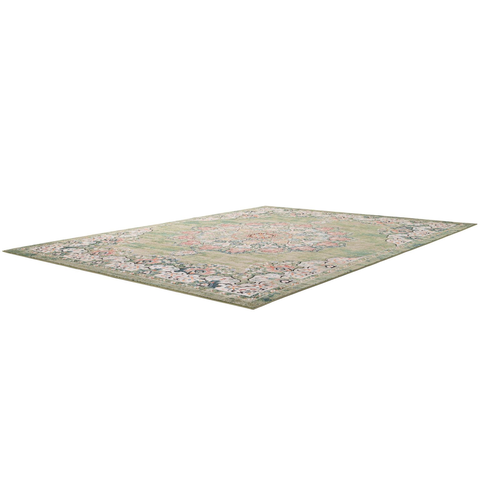 A bold medallion anchors this traditional Persian?inspired rug, its layered floral petals and scrolling corner spandrels set against a fern green field that gives the design depth. The palette balances earthy neutrals—beige and ivory—with darker outlines in navy blue and black, while pops of blue, orange, plum red and puce add lively contrast throughout the central motif and border. The pattern uses a subtly distressed finish that softens the geometry and creates a gently aged, lived?in look.