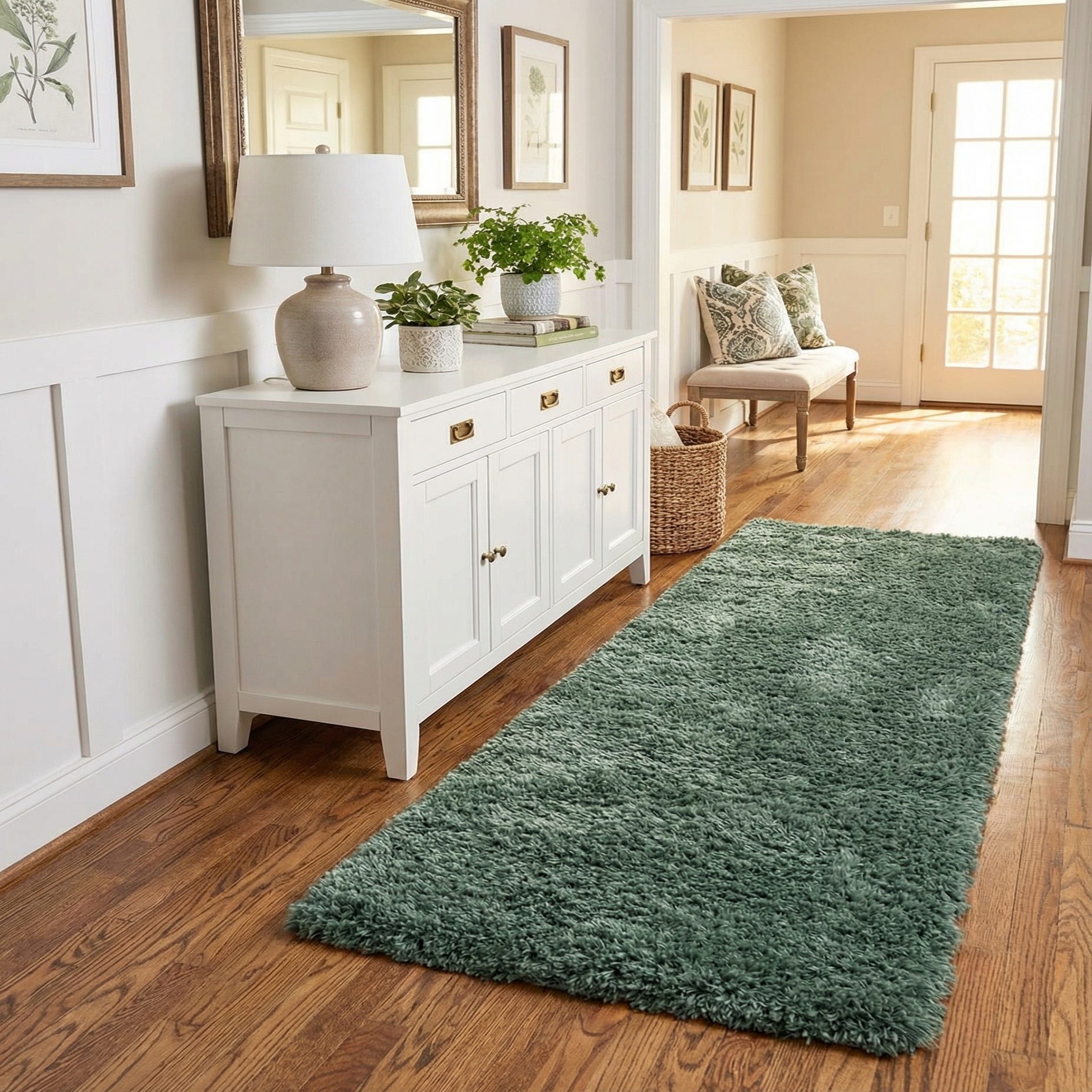 A plush, deep green shag runner rug, 10 ft long, with a textured pile, perfect for a hallway.