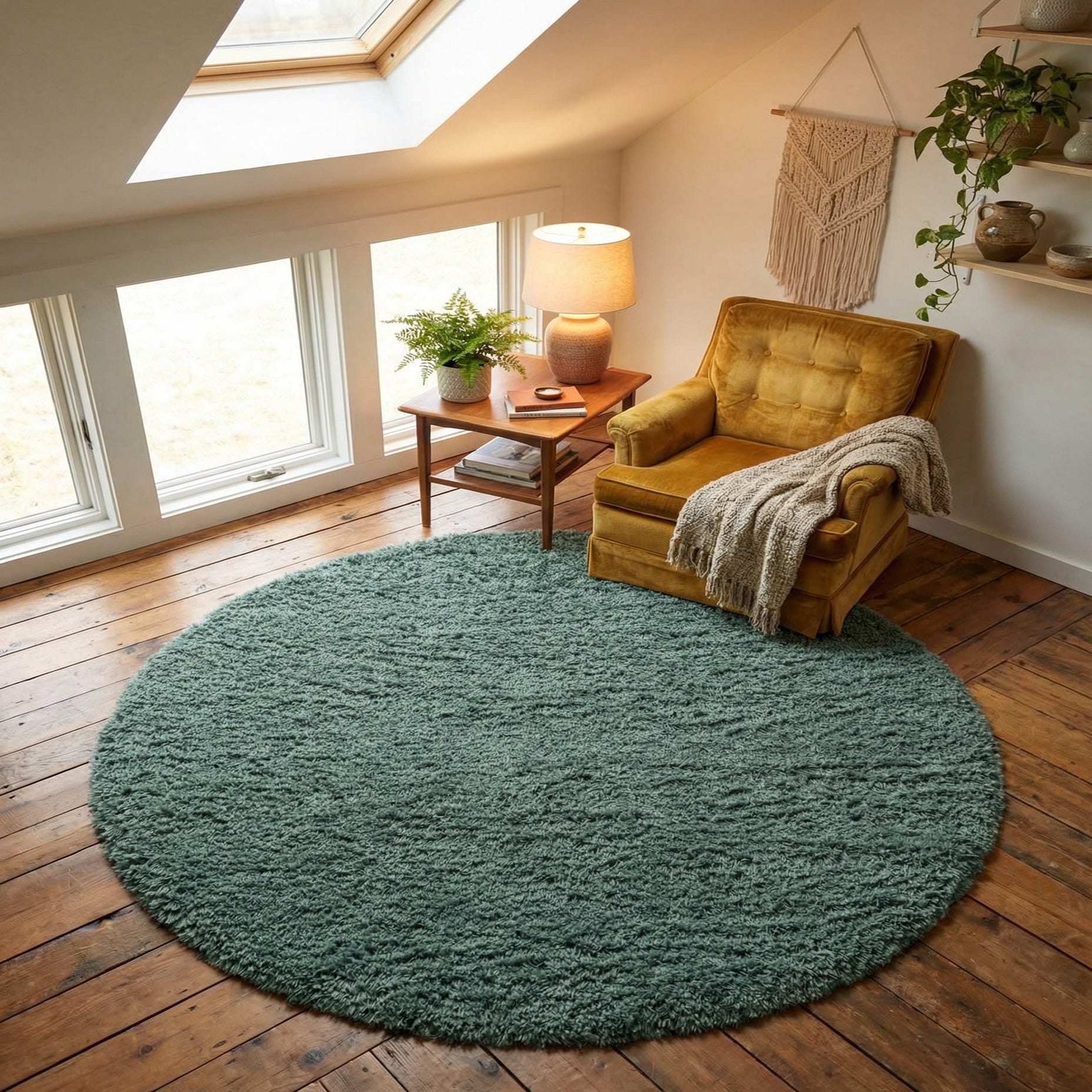 Use this piece to anchor a seating group beneath a round coffee table, layer it at the foot of a bed for added warmth, or place it in a reading nook to soften hardwood or tile. The rich forest hue pairs nicely with warm wood tones, leather sofas, brass or matte black metal accents, and linens in cream or muted earth tones. It fits well with mid-century modern, Scandinavian, bohemian, and contemporary interiors where a touch of plush texture and a grounded color are desired.