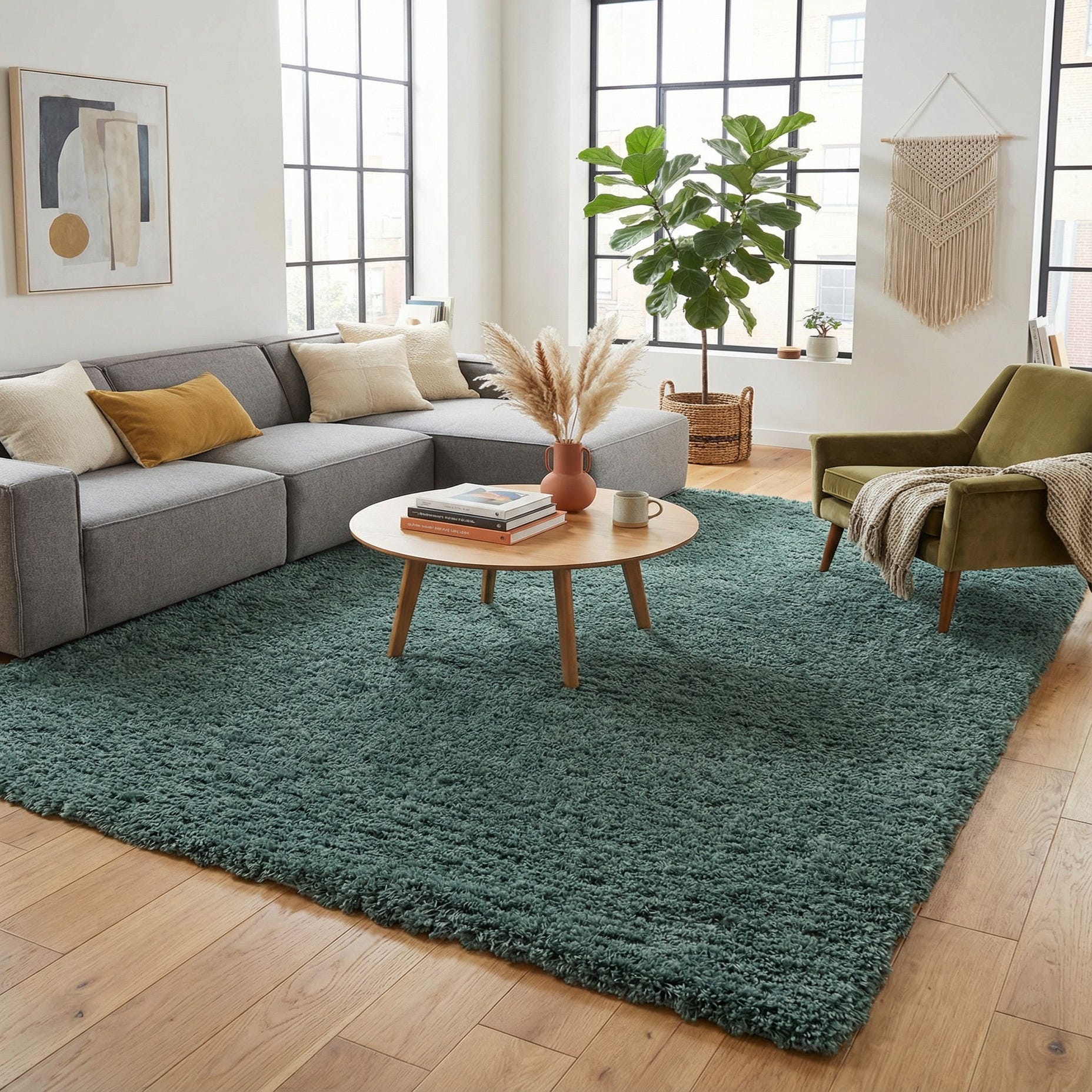 A dense, high-pile shag in a deep Forest Green, this machine-made rug is crafted from 100% polyester. Long, plush fibers create a soft, velvety surface that cushions underfoot and catches the light to produce subtle tonal shifts across the field, adding visual depth to a single-color design. The simple, solid pattern and tactile pile give the rug a contemporary yet comfortable presence that complements a range of interiors.
