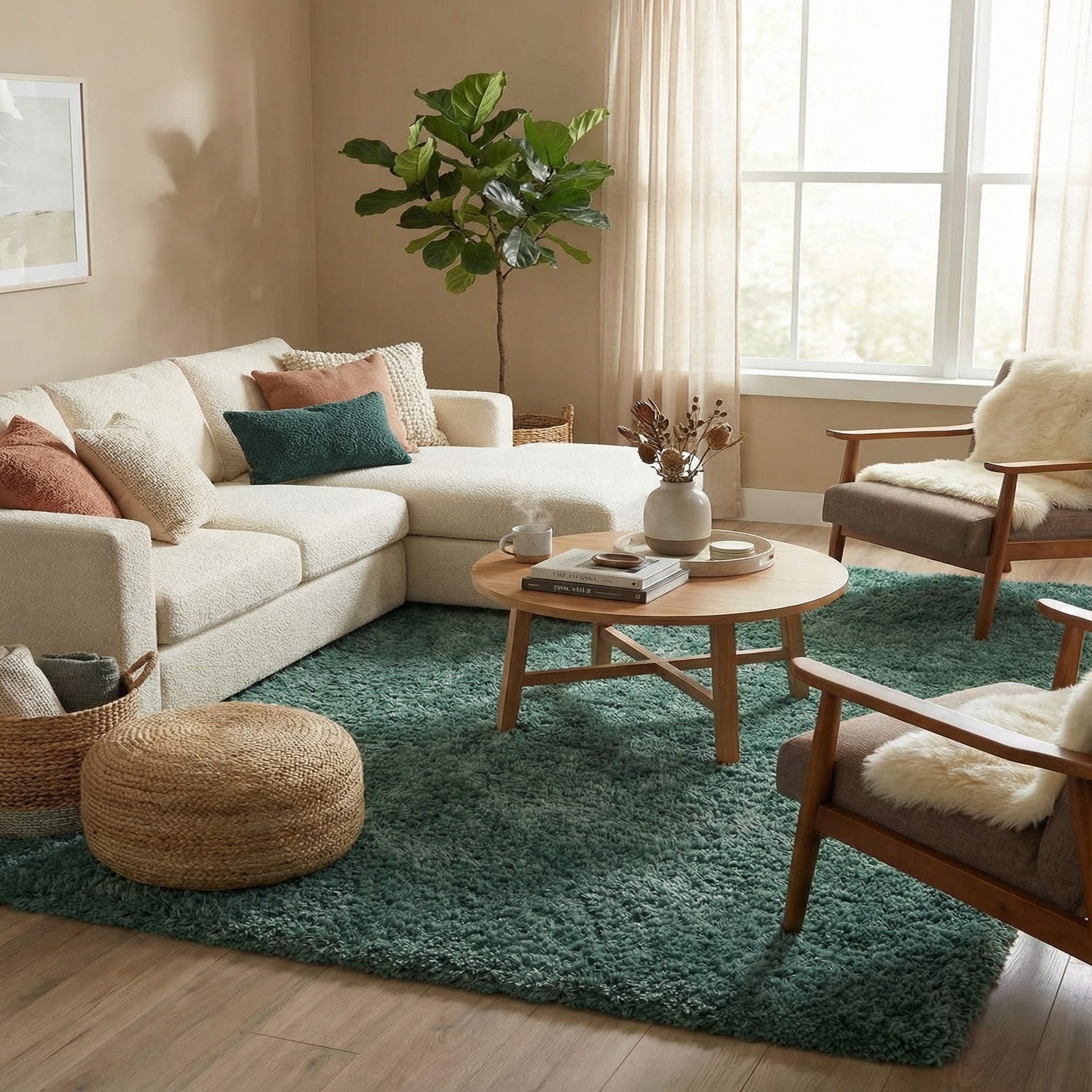 Place it under a low-profile sofa to define a living room seating area, layer it at the foot of a bed for extra warmth, or slide it into a cozy reading corner to soften hard flooring. It pairs nicely with warm wood tones, neutral upholstery, brass or black metal accents, and patterned throws or pillows for contrast — well suited to modern, mid-century, and bohemian schemes where a rich color and plush texture can anchor the room.