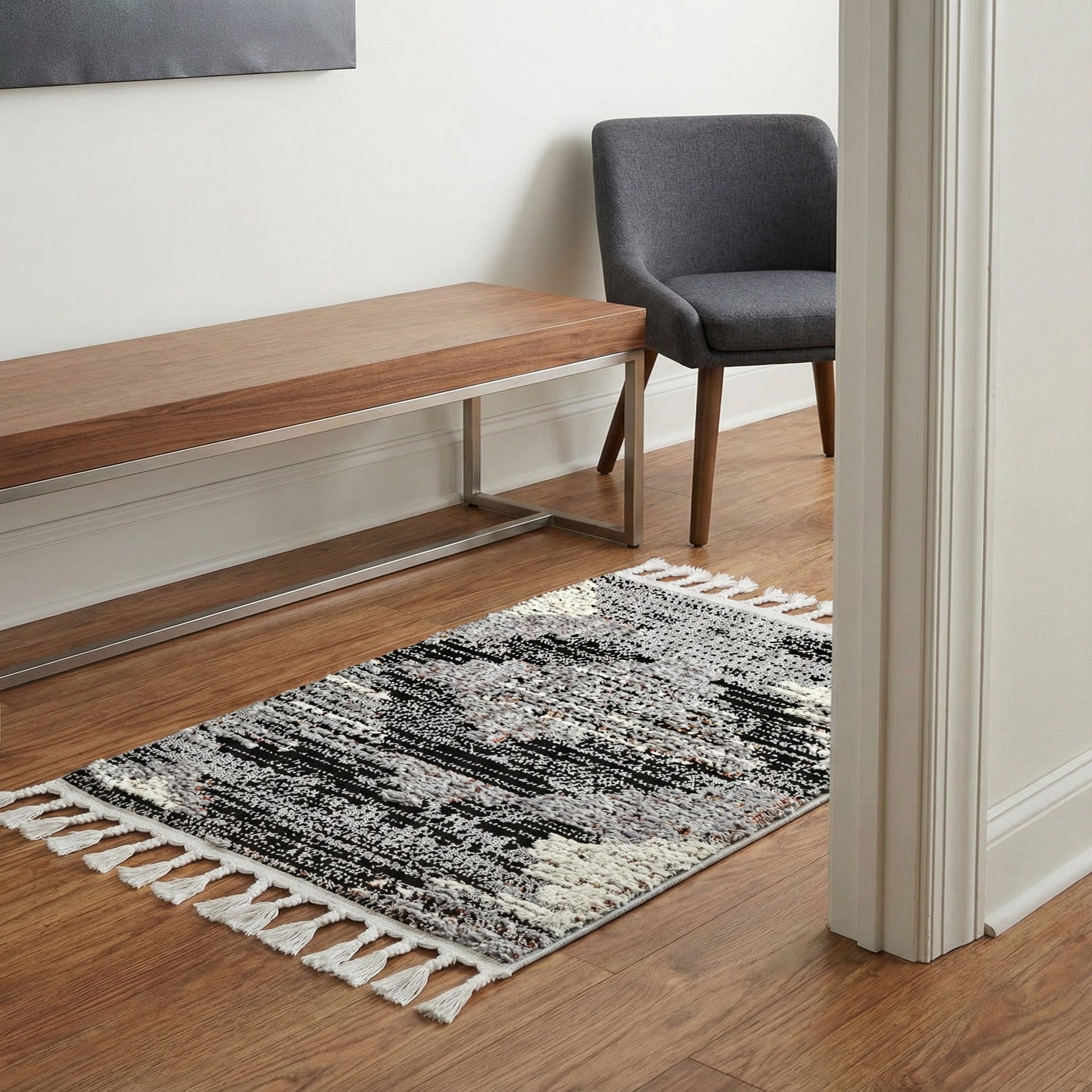 A Fossil Gray background provides a calm, neutral base for an abstract, slightly distressed pattern in Black, Ivory and varying Grays. Irregular medallion shapes and horizontal striations create visual movement across the surface, while short knotted fringe at each end adds a touch of handcrafted character. The contrast of dark linear elements with lighter, cloud-like clusters gives the rug a contemporary, textured look that anchors a room without dominating it.