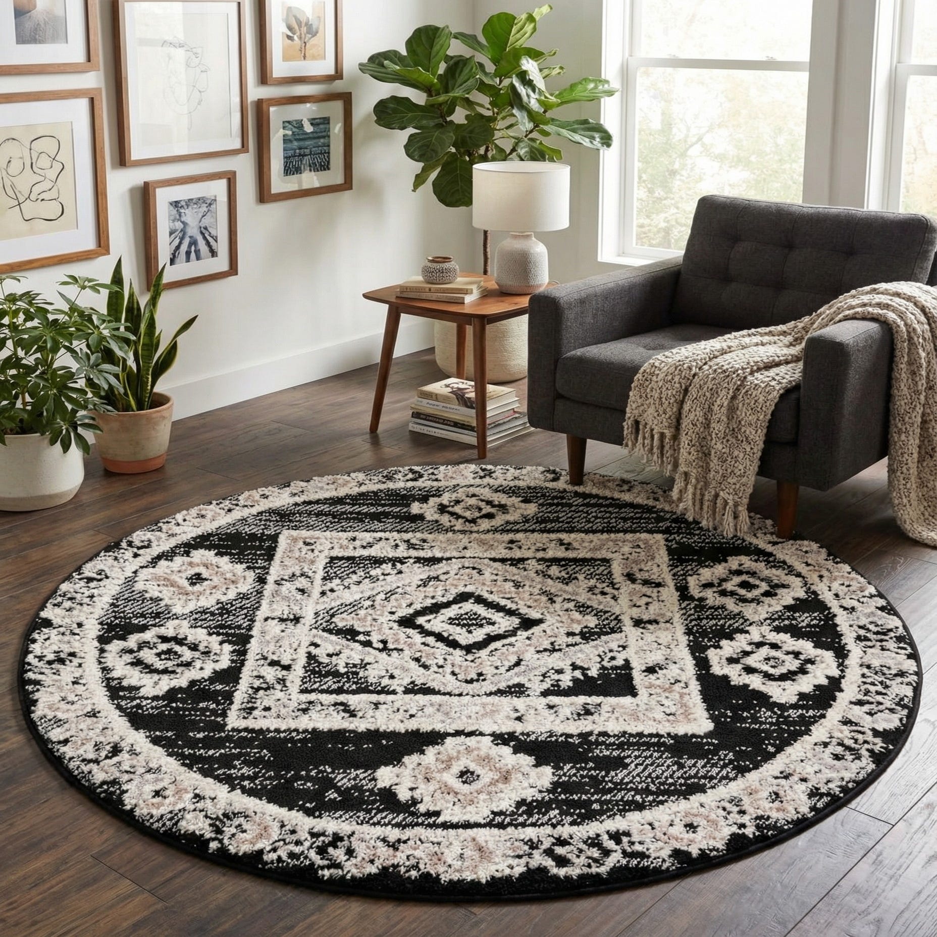 A round rug with a strong medallion motif set inside a squared frame, this piece pairs geometric accents with a gently distressed field. The background is Fossil Gray, while the raised pattern is Ivory, creating clear contrast and visual depth. The design combines central diamond forms and repeating circular medallions around the border for a timeless, transitional look that complements both classic and modern furniture arrangements.
