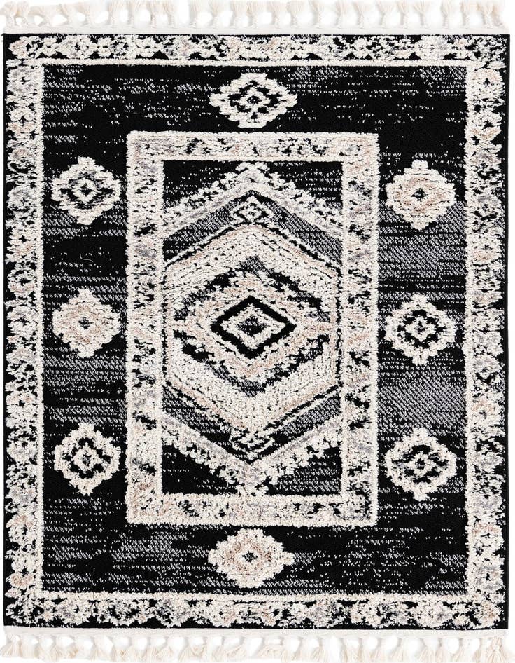 Machine made from 100% polypropylene, this rug fits well into a range of interiors. It pairs naturally with light- to medium-toned wood and matte Black metal accents in modern farmhouse or transitional living rooms, and it can ground a small seating area, define an entryway, or sit at the foot of a bed. The neutral palette of Fossil Gray, Black, and Ivory also makes it an easy layering piece for boho or minimalist schemes that benefit from high-contrast pattern and texture.