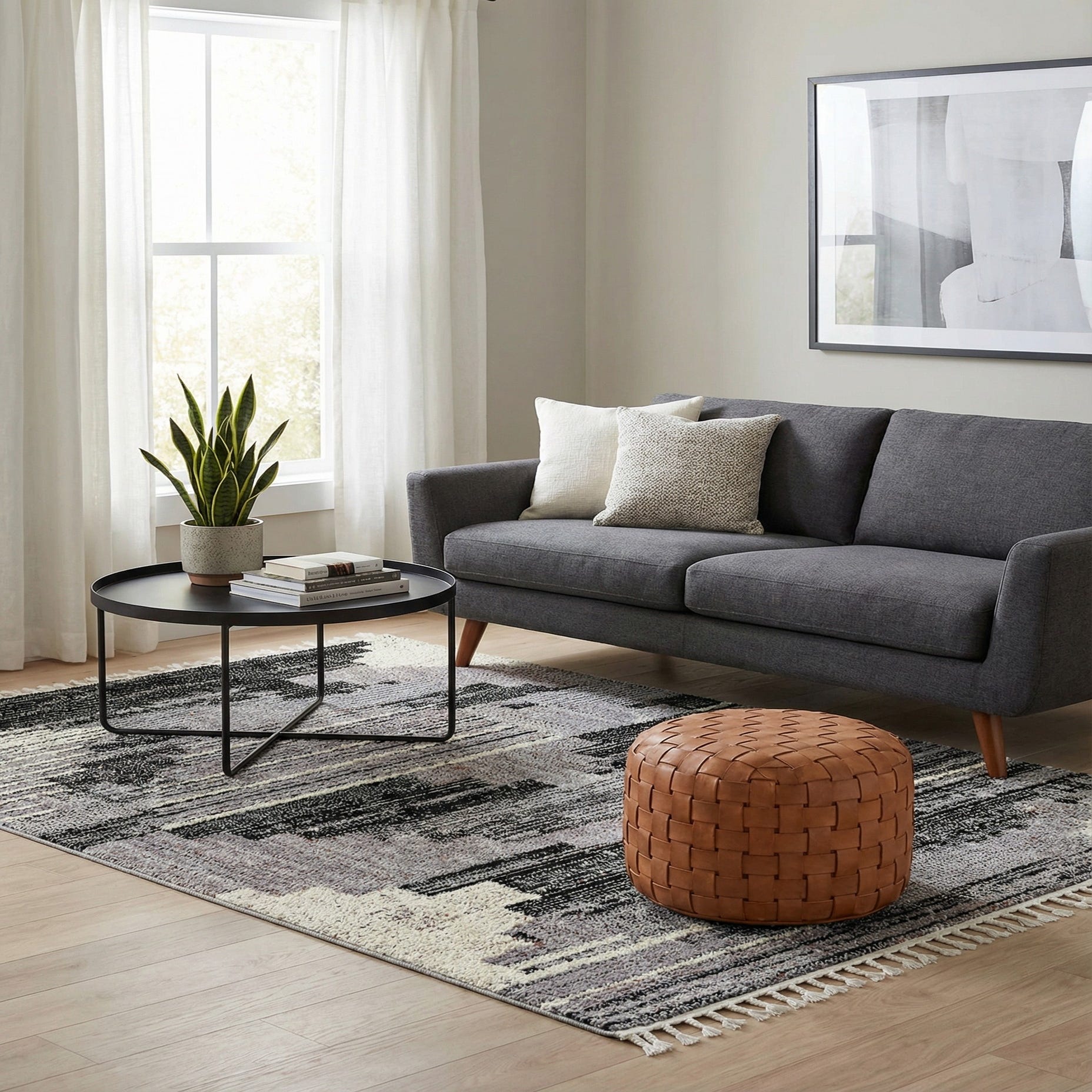 This palette and pattern work well in a minimalist living room or urban loft alongside metal and wood furnishings, or layered in a cozy bedroom with neutral bedding and textured throws. It also complements monochrome spaces where you want graphic contrast without overwhelming color, and fits easily beneath a coffee table or in an entryway to anchor a modern seating area.