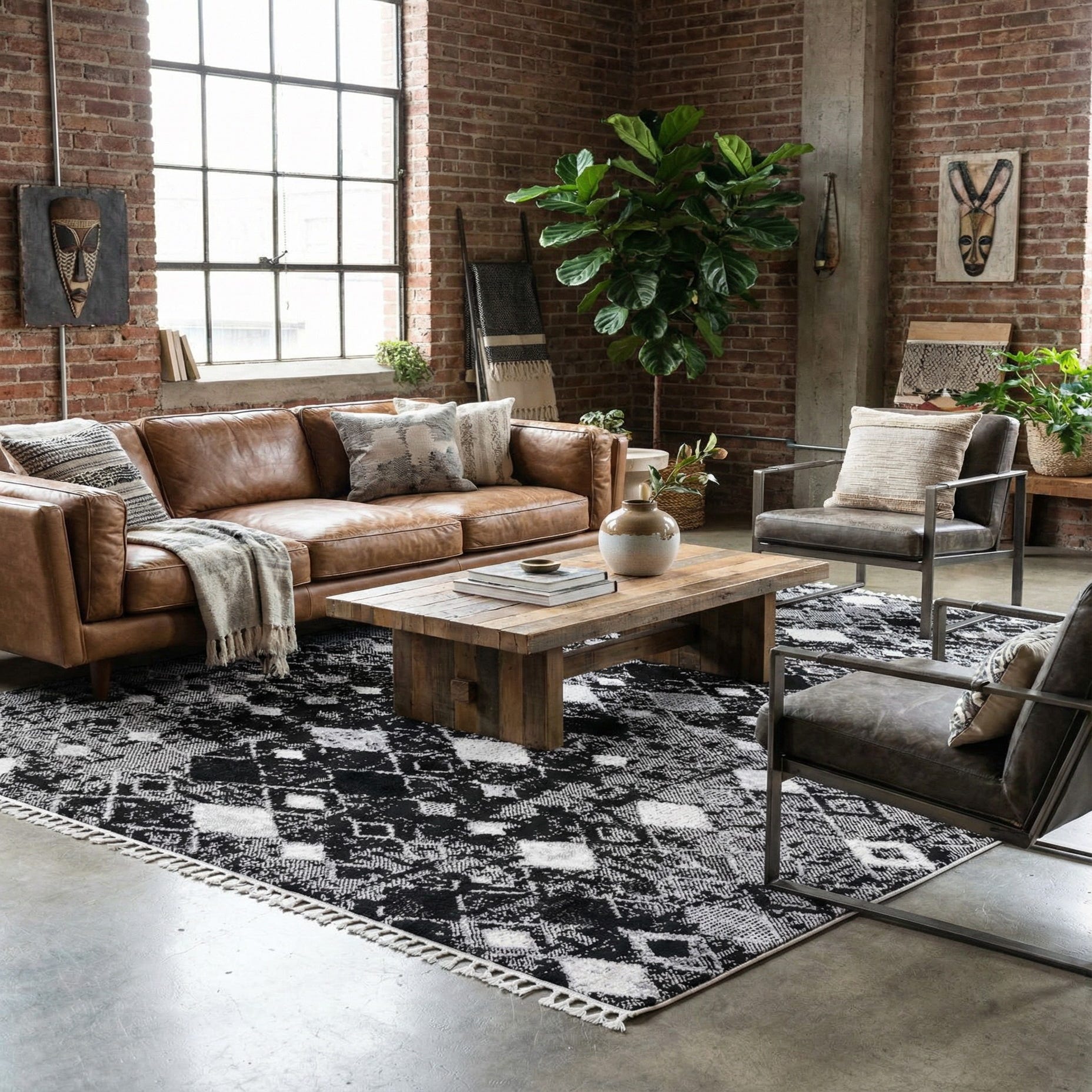 This rug works well as an anchor in contemporary and transitional interiors — place it beneath a charcoal leather sofa and a light wood coffee table for a modern living room, or set it under a simple dining table to add graphic interest without overwhelming the space. It also suits industrial or modern farmhouse schemes when paired with metal accents and natural wood, and fits neatly in a bedroom or home office to ground neutral furnishings and layered textiles.