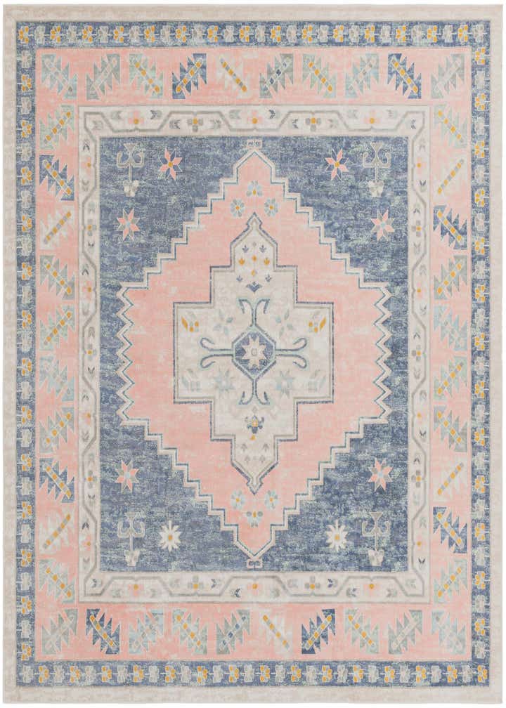 Primary color is French Blue. Colors in this rug include: French Blue, Beige, Ivory, Gray, Light Blue, Light Green, Gold, Blue, Pink.