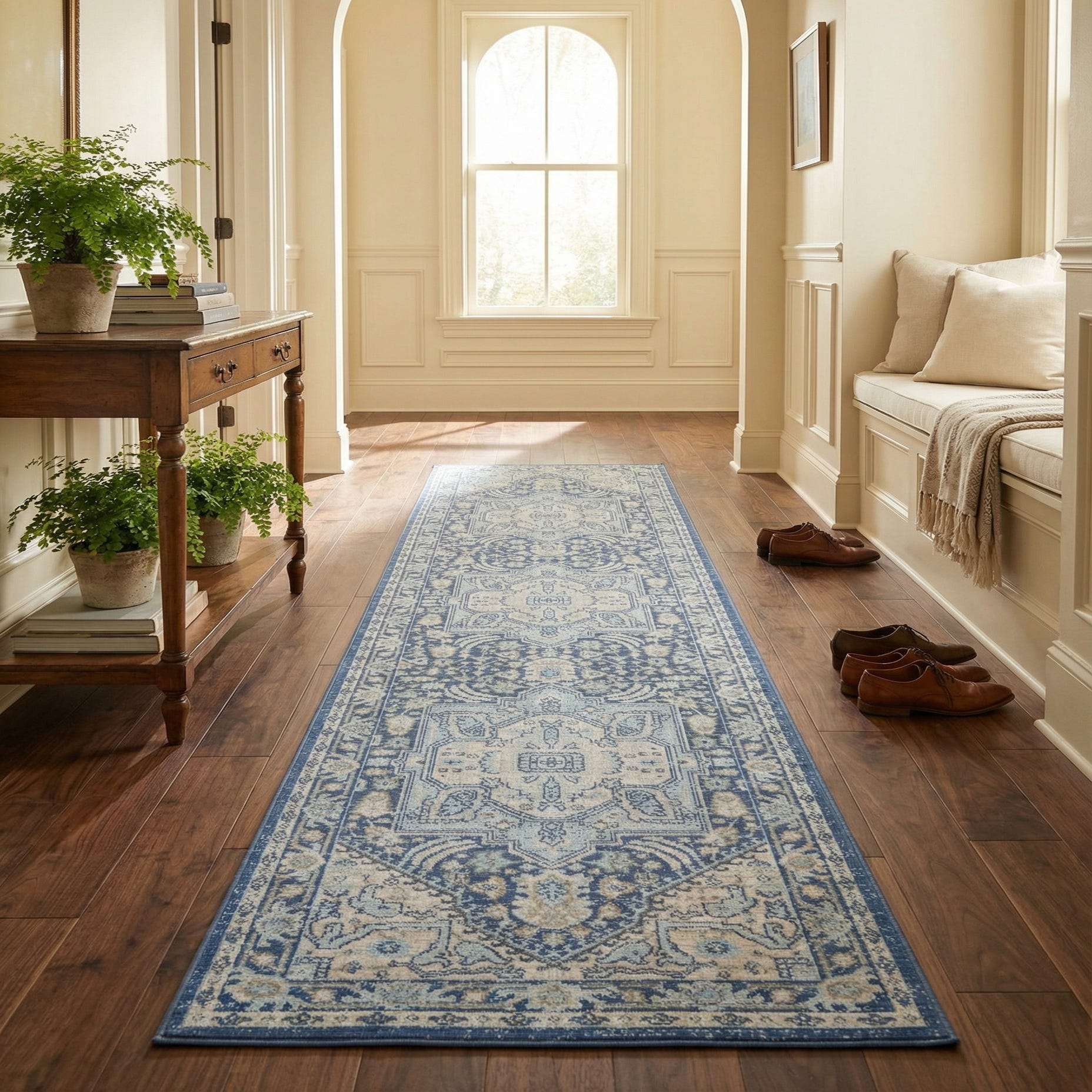 Primary color is French Blue. Colors in this rug include: French Blue, Ivory, Light Blue, Gray.
