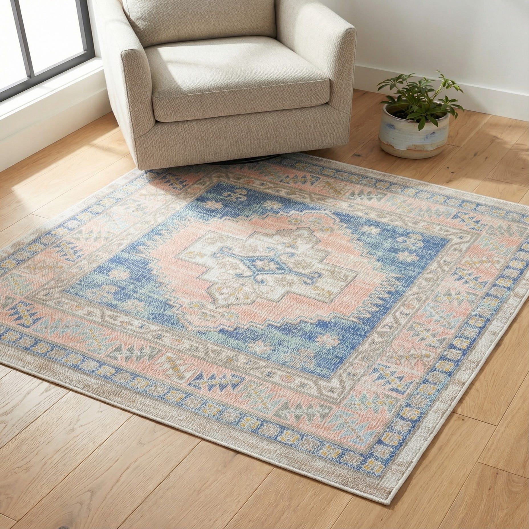 A classic medallion layout sits against a French Blue field, where a stepped diamond center in soft pink and ivory anchors a series of layered borders. The design blends geometric motifs and small floral rosettes, with accents of beige, gray, light blue, light green and touches of gold that add subtle warmth. A distressed, vintage-wash finish softens the palette and gives the pattern a lived-in, collected look that balances traditional and transitional sensibilities.