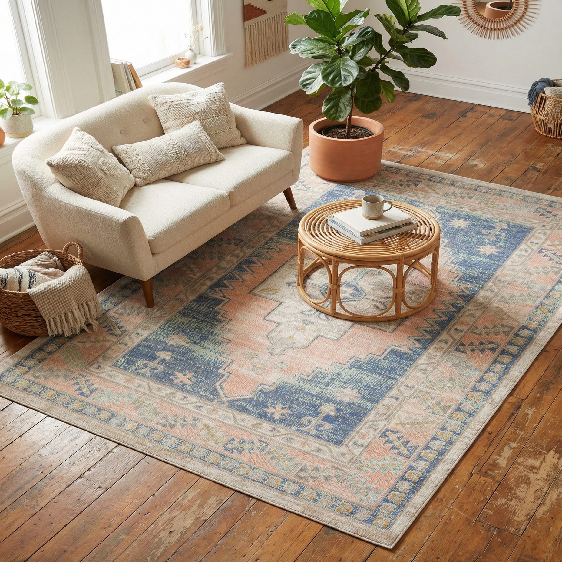 Machine-made from 100% polypropylene, the rug has a low, soft pile that feels smooth underfoot and lays flat for easy placement. Its color palette and refined pattern pair well with light-wood furniture and linen upholstery for a coastal or cottage-style living room, and it also brings a calm, layered look to a bedroom or nursery. Use it to anchor a small seating area, place under a console in an entryway, or layer over hardwood to introduce subtle color and pattern without competing with bold décor.