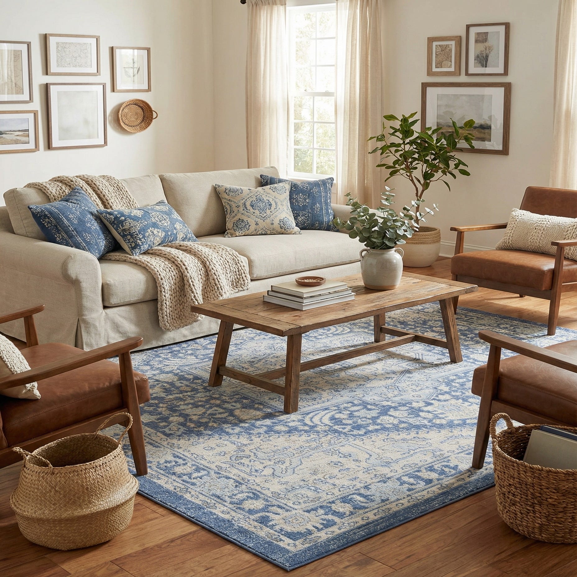 A square 8' x 8' Rugs.com Whitney rug in shades of blue with a vintage medallion pattern and farmhouse style.