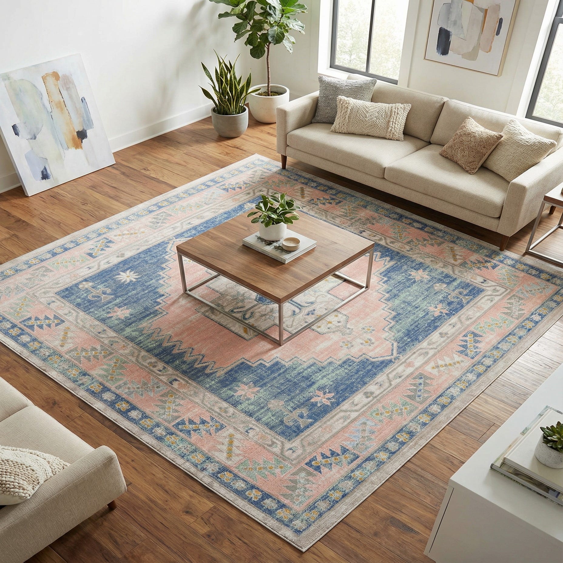 The colorway and balanced geometry make this rug a versatile anchor for a variety of interiors. Use it to center a seating group in a living room with pale wood and linen upholstery for a coastal or cottage feel, place it under a square dining table to introduce gentle color without overwhelming the space, or layer it in a bedroom to soften hardwood floors while complementing brass or gray accents for a modern-vintage or transitional look.