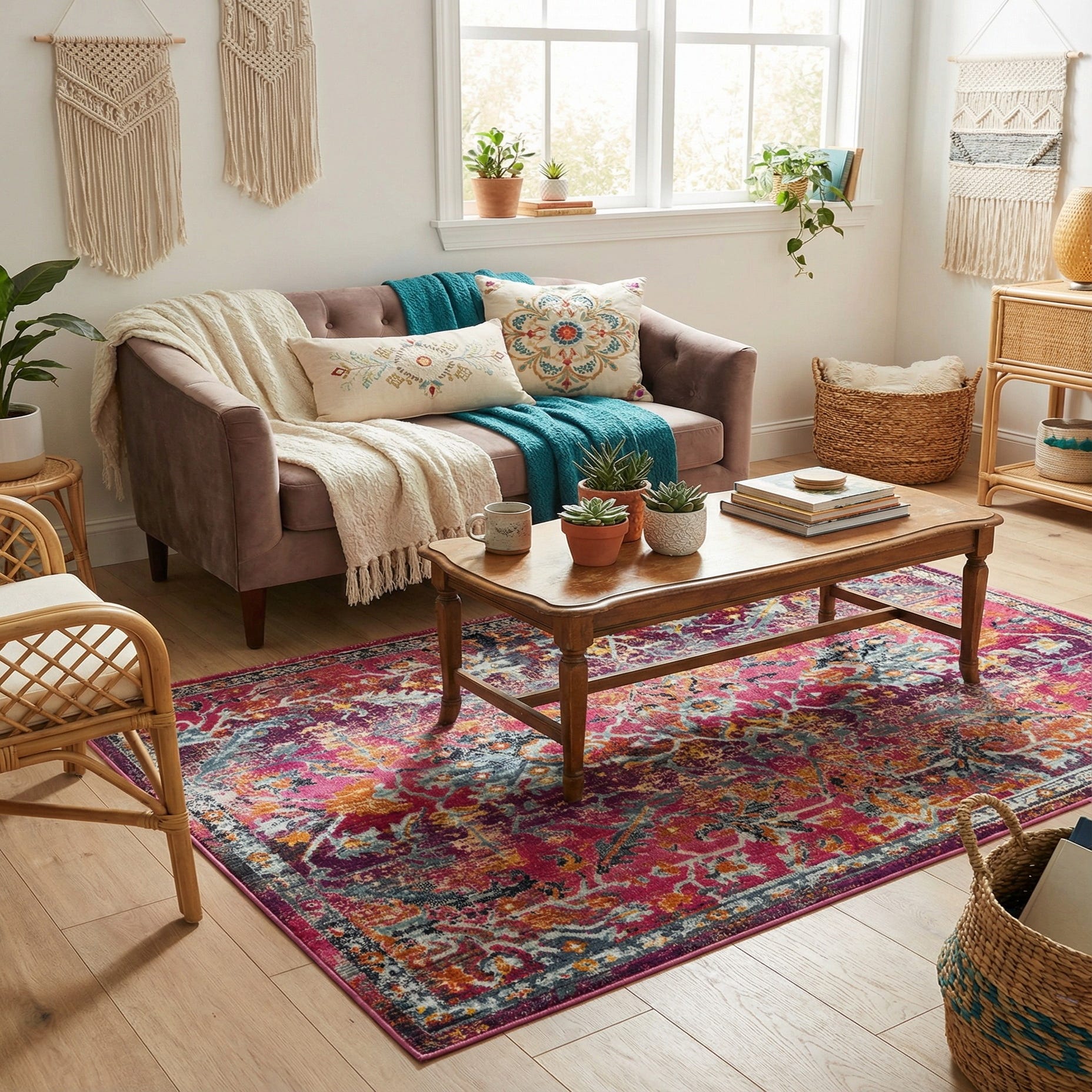 Machine-made from 70% polypropylene and 30% polyester, the pile is low and tightly woven, offering a smooth, velvety hand underfoot that shows off the jewel-like colors. This rug works well in modern bohemian or eclectic living rooms, paired with neutral sofas and brass or warm wood accents; it also livens a minimalist bedroom, a creative home office, or an entry layered over hardwood. Use it to introduce color into a calm palette or to complement velvet furniture and metallic finishes for a polished, energetic look.