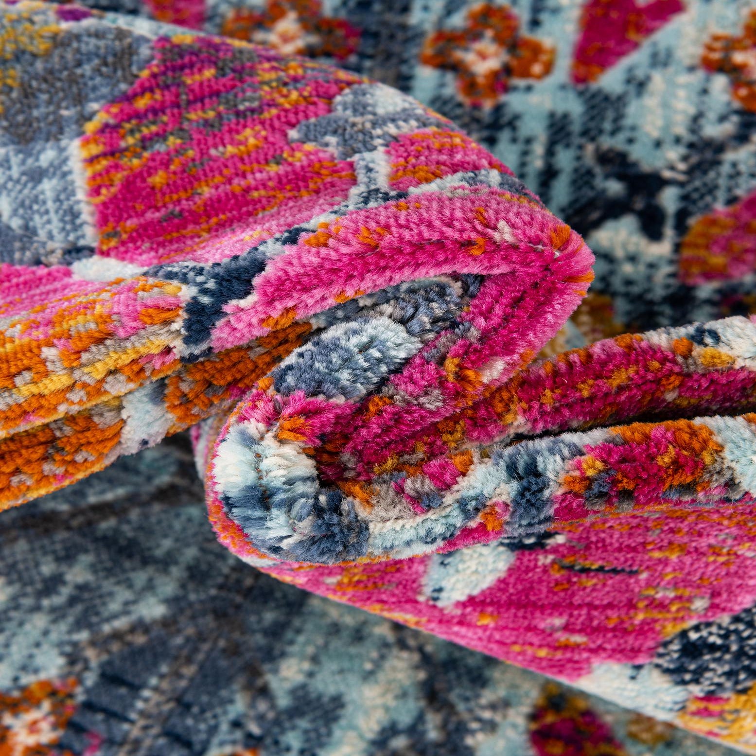 A vivid fuchsia field sets the stage for a vintage-inspired medallion and scrolling floral pattern rendered in gold, light blue, ivory, gray, violet and blue. The design has a layered, slightly distressed look with ornate arabesques and a narrow ornamental border that gives the piece an antique, overdyed character. Run your hand across the low pile and you’ll notice a smooth, slightly lustrous surface with a soft, brushed feel that highlights the color contrasts and fine motif work.