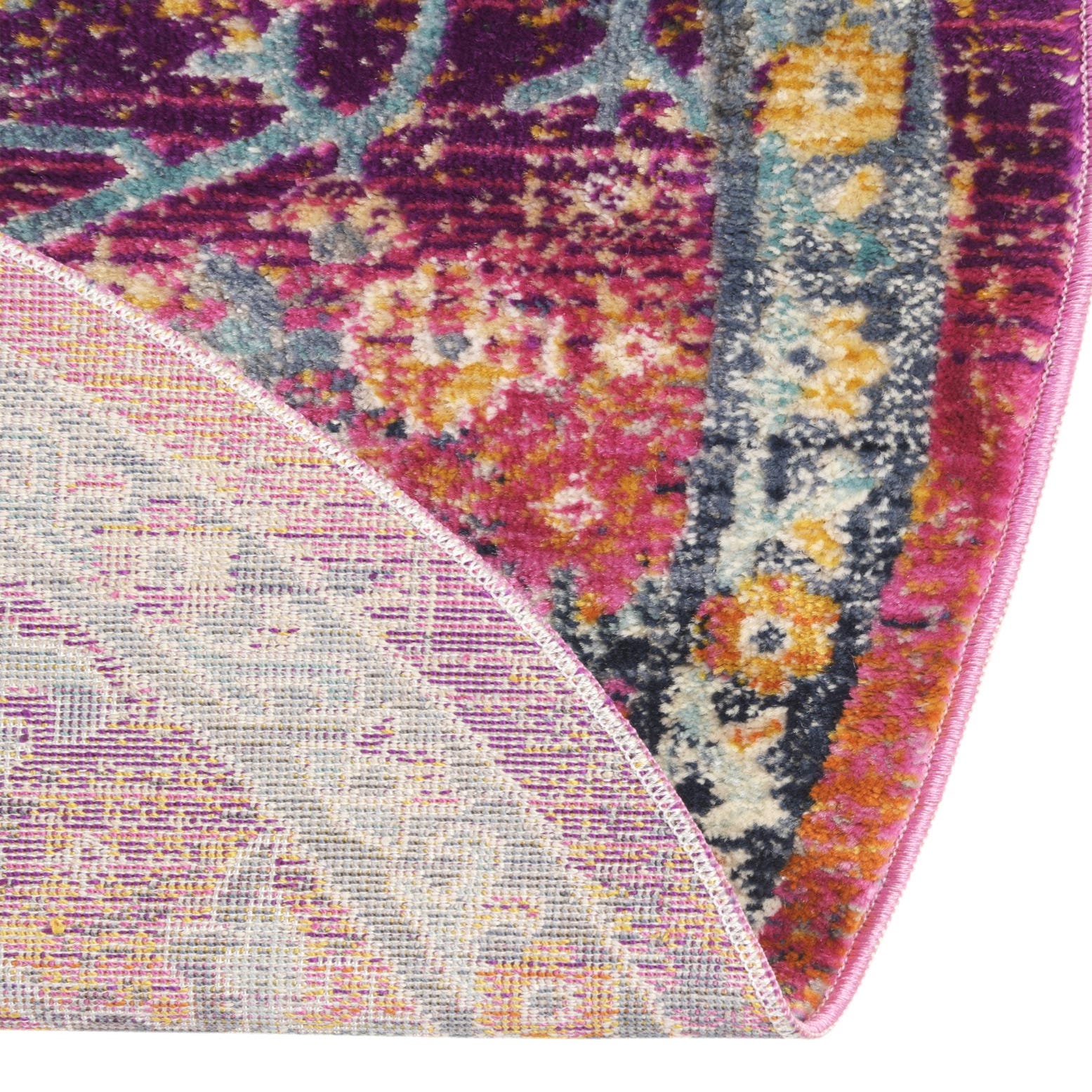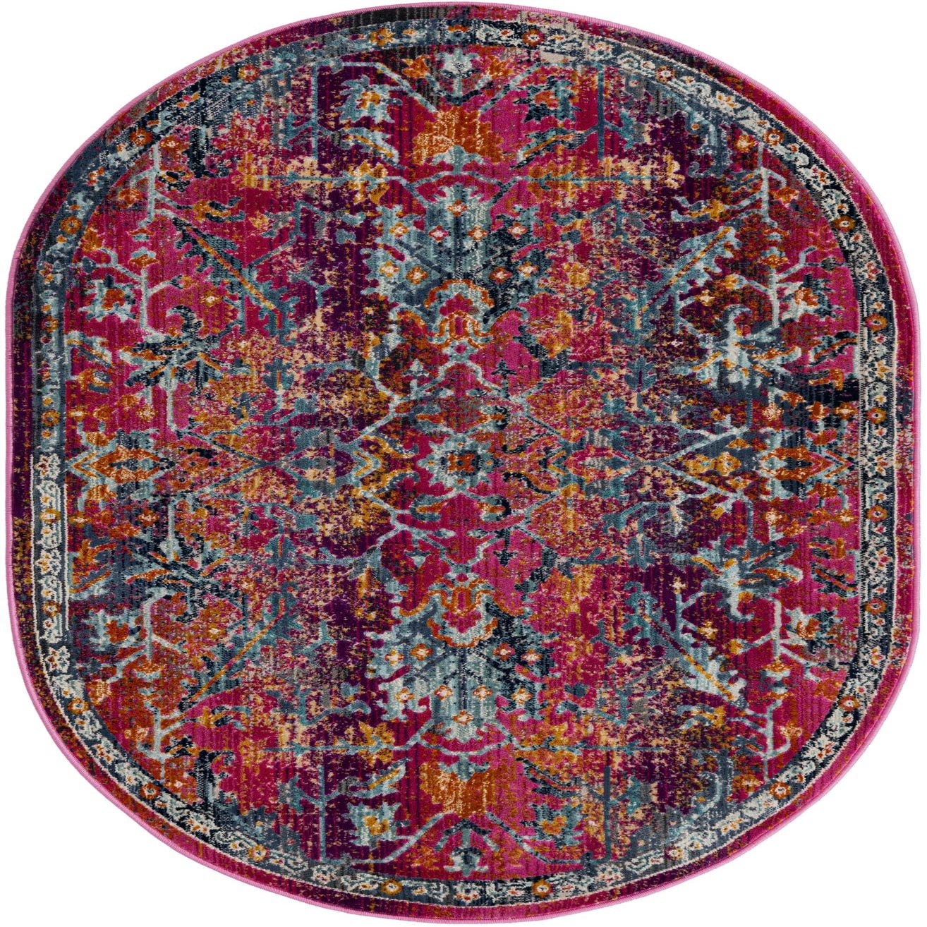 A vibrant 3' 7 x 5' 3 oval rug with a distressed traditional pattern in shades of pink, purple, teal, and orange.