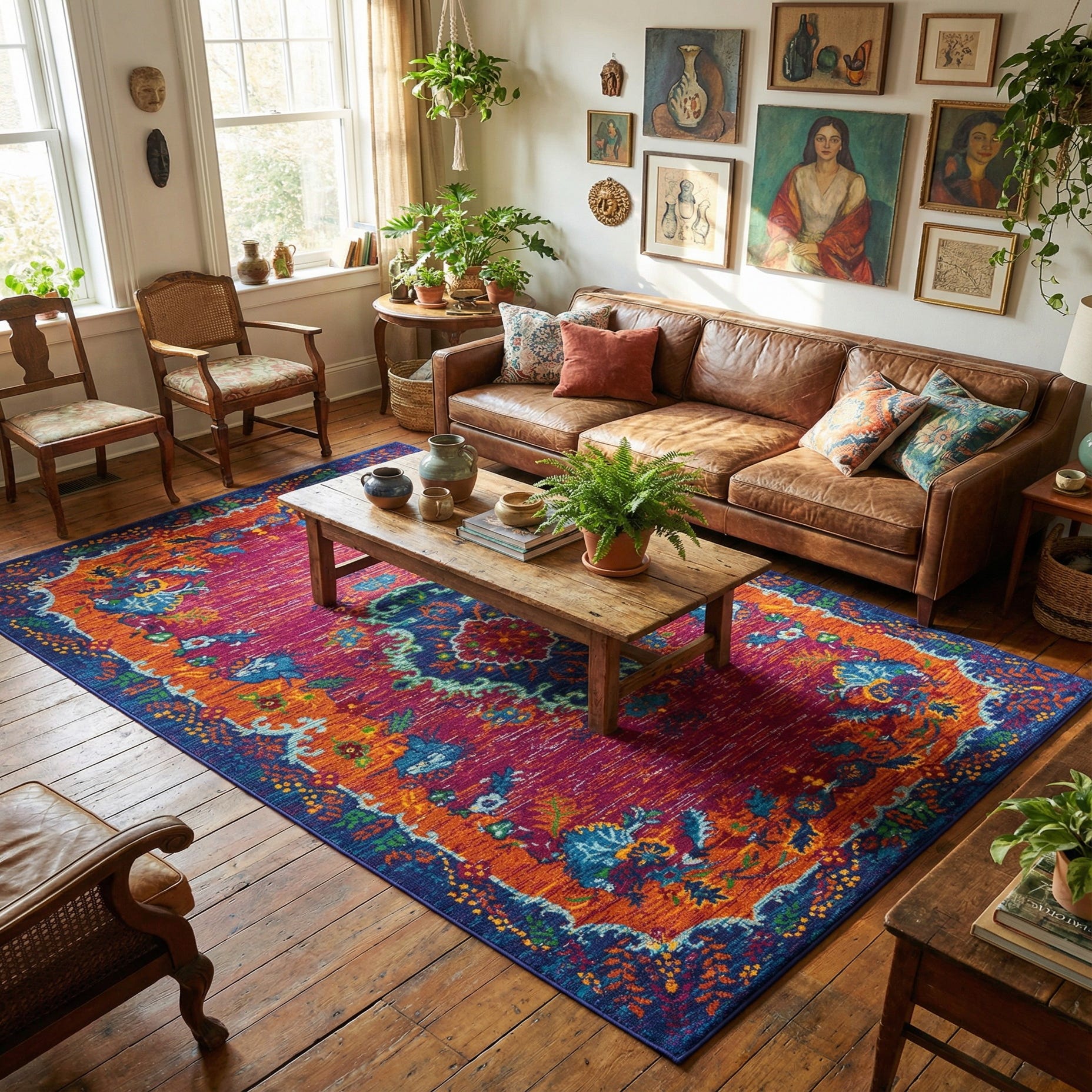 The intricate design exudes a bohemian flair, with nods to traditional motifs, making it an ideal choice for eclectic interiors or rooms seeking a pop of color. The saturated hues can anchor a space with wooden or neutral furnishings, or complement a daring decor theme brimming with color and life. Given its polypropylene construction, this rug is suitable for high-traffic areas like living rooms and family rooms, as well as creative spaces or children's rooms where its vibrant energy and resilient nature would be particularly appreciated.