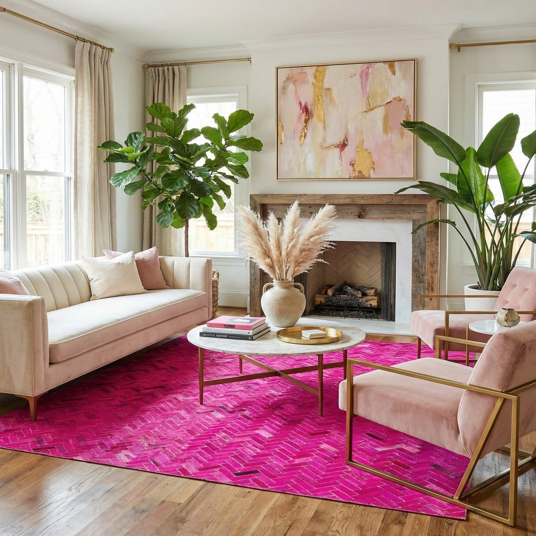 A vibrant 5x8 rectangular pink cowhide rug with a modern herringbone pattern, perfect for a living room.