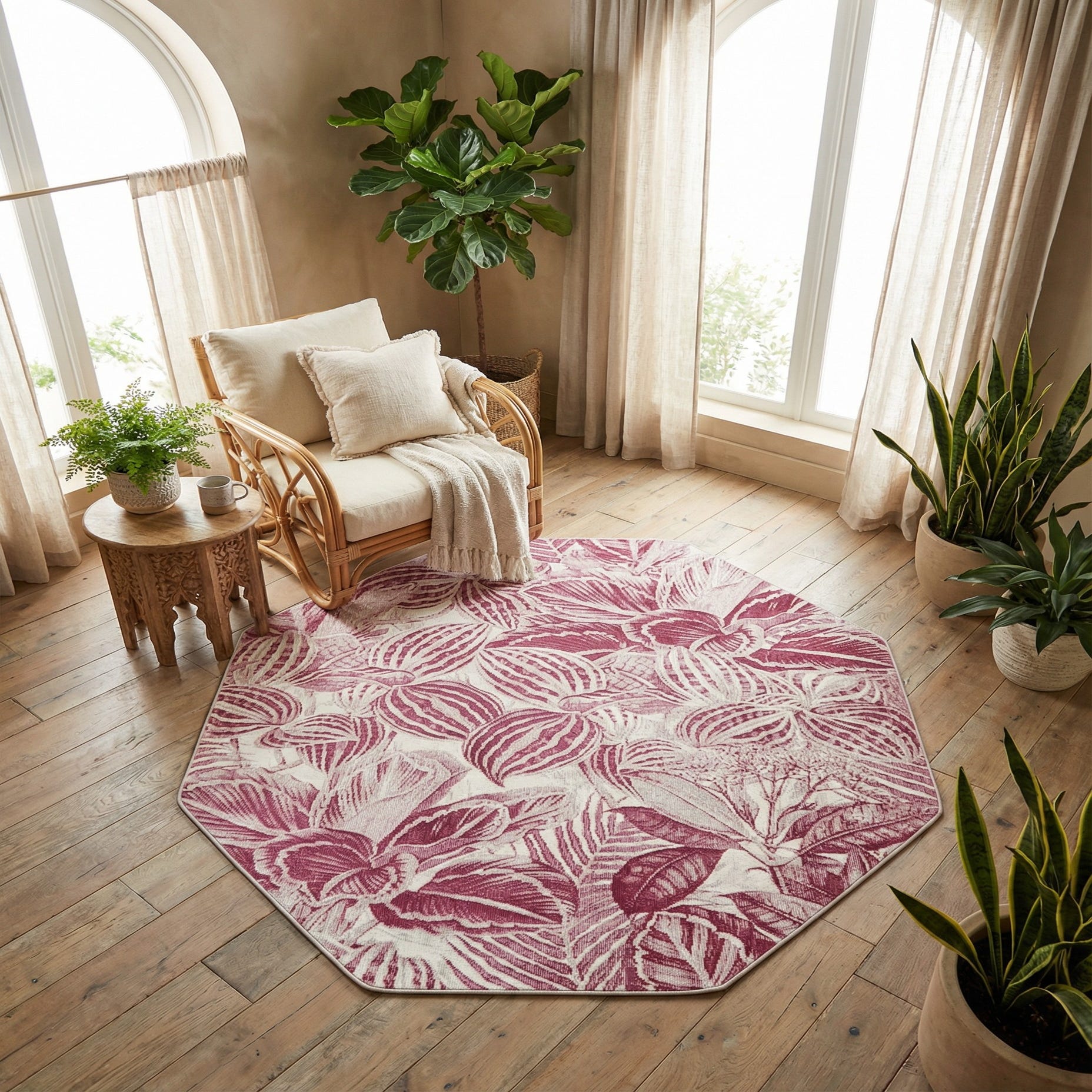 A bold botanical pattern fills this octagonal rug, with layered leaves and floral forms rendered in fuchsia, pink, and ivory. The fuchsia background provides a vivid backdrop while ivory highlights and pink shading create depth and a hand-drawn quality to the design. Machine-made from 100% polypropylene, the rug has a low-pile, tightly woven surface that feels smooth underfoot while the pattern provides a subtle, tactile texture.