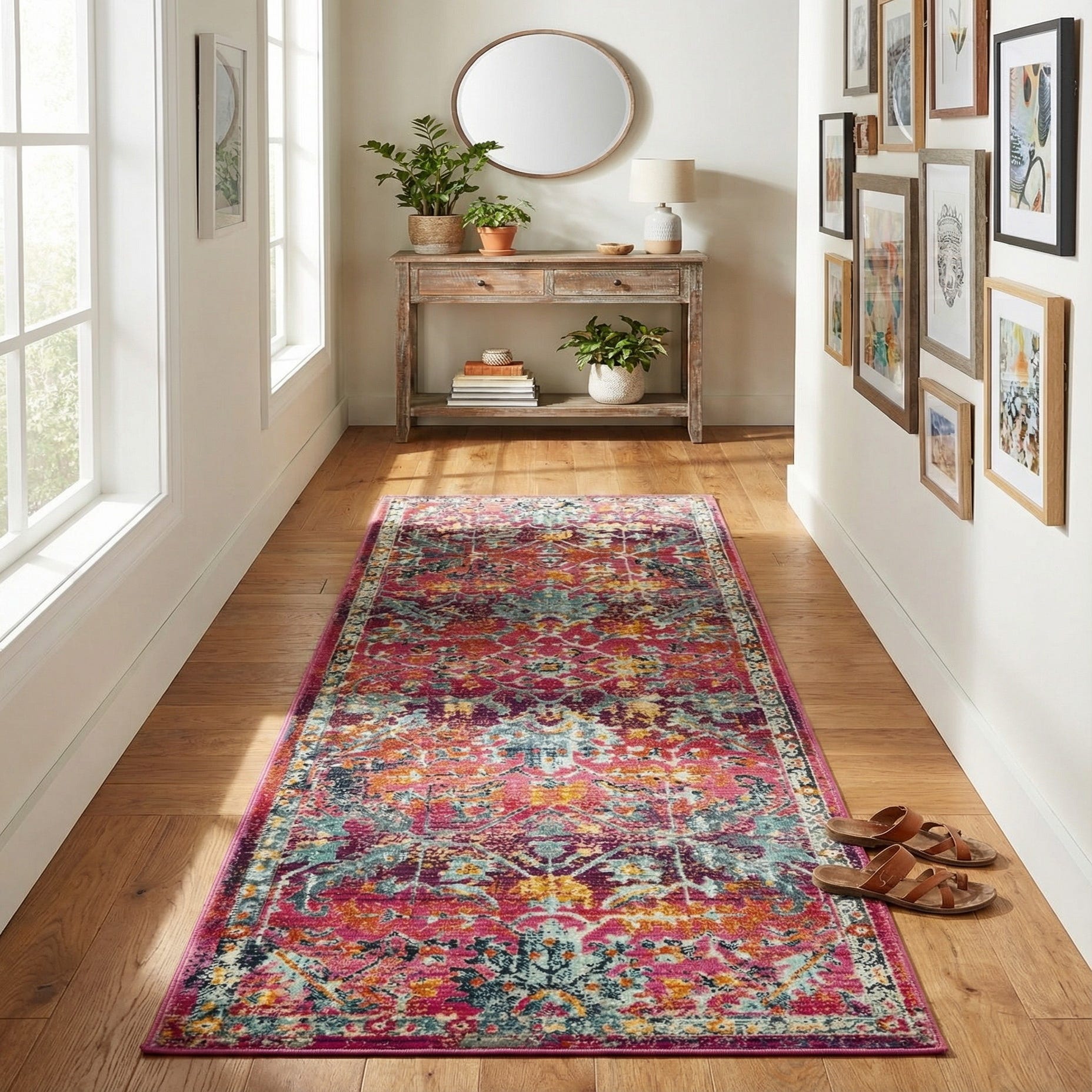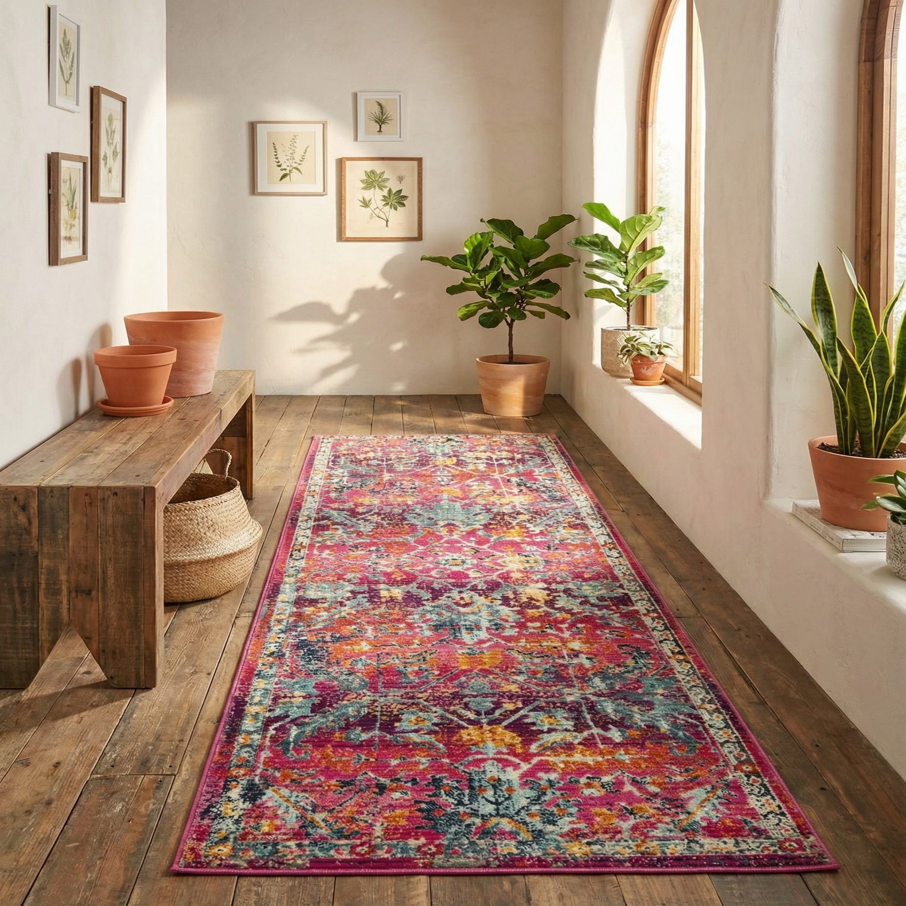 Bright and confident, this runner brings instant personality to narrow spaces such as hallways and entries and works equally well as an accent in a layered bedroom or a colorful kitchen aisle. The saturated fuchsia backdrop pairs nicely with warm woods and brass accents for a modern-glam look, or with neutral furnishings and textured linens to introduce a lively pop of color in transitional and bohemian interiors.