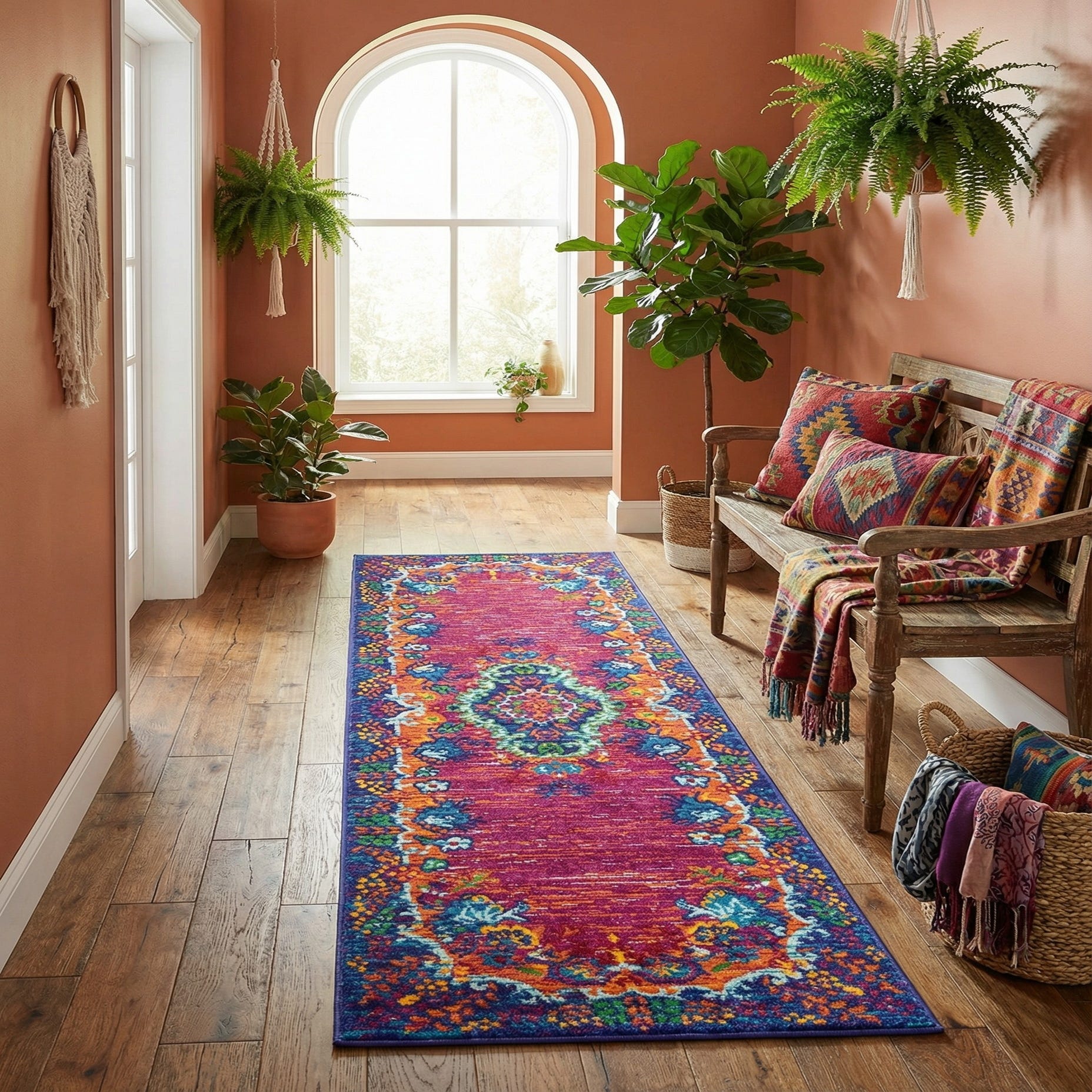 This runner works well in a bright, eclectic entryway or hallway where it can act as a focal accent against natural wood or neutral tile. It also complements mid-century and bohemian interiors when layered with textured throws and warm metallic accents, or adds a lively contrast in modern minimal spaces with white walls and sculptural furniture. Use it to introduce color and pattern in narrow rooms, between kitchen cabinets, or alongside a bed to anchor a jewel-toned scheme.