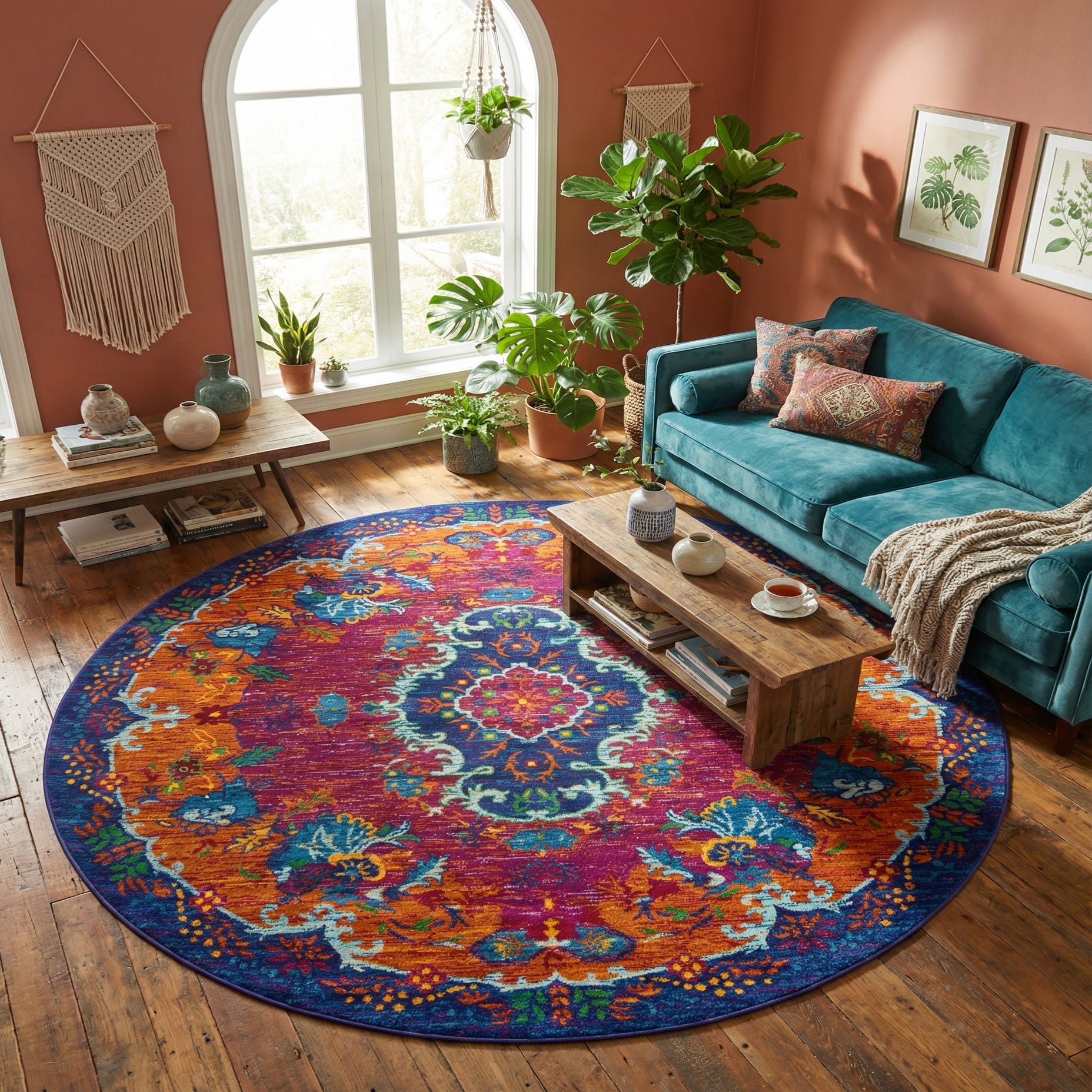 This rug works well in eclectic, bohemian, or global-inspired interiors and is a strong choice when you want a color-forward focal point. Anchor a round dining table, place it beneath a seating grouping to add warmth to a neutral living room, or set it in a bedroom to brighten the foot of the bed. Pair with warm wood tones and brass or matte-black accents, or layer it with solid navy or teal upholstery to reinforce the medallion’s palette.
