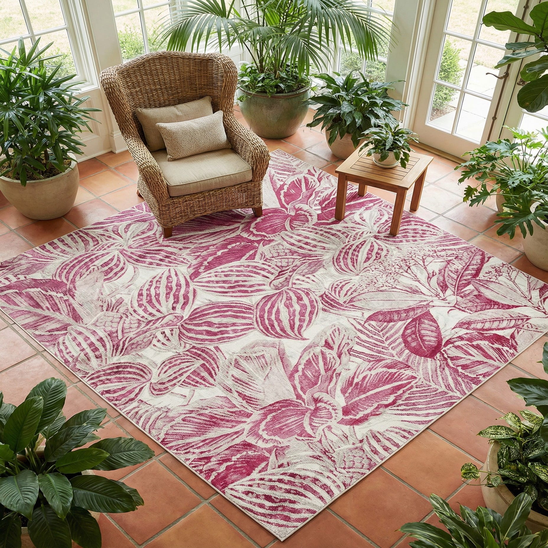 A fuchsia background anchors a lush botanical pattern of oversized leaves and blooms rendered in ivory and pink. The design mixes linear striped foliage with broader, painterly petals to create a layered, contemporary floral look that reads modern and organic at the same time. Machine-made from 100% polypropylene, the rug has a low, dense pile that feels soft underfoot while the pattern is given subtle tactile definition through slight variations in pile and color.