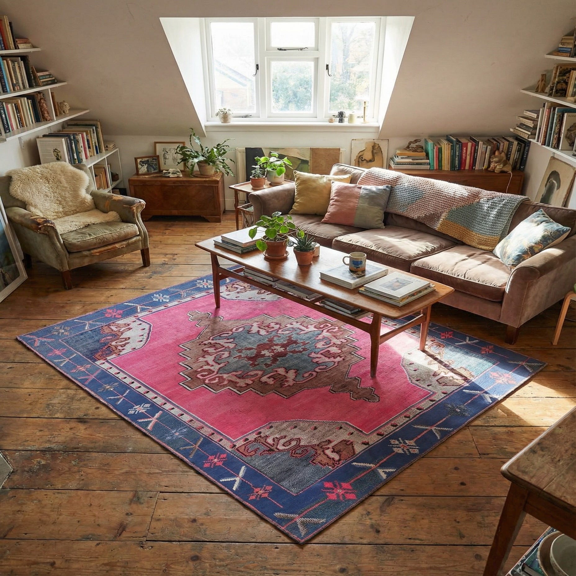 Primary color is Fuchsia. Colors in this rug include: Fuchsia, Black, Brown, Ivory, Red, Violet.