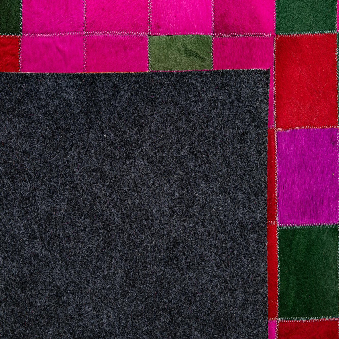 A vibrant 8x10 rectangular patchwork cowhide rug, featuring a modern design with dominant pink squares interspersed with red, green, and blue.