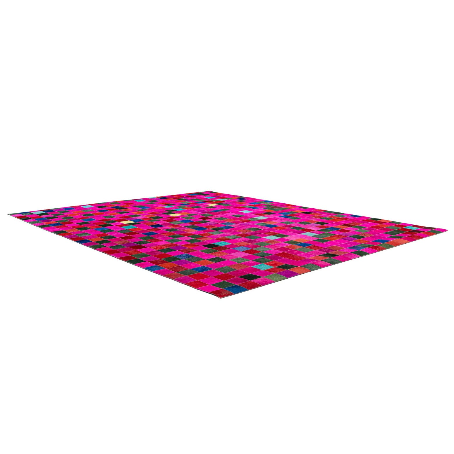 A vibrant 8x10 rectangular patchwork cowhide rug, featuring a dominant fuchsia pink with scattered squares of red, blue, green, and yellow.