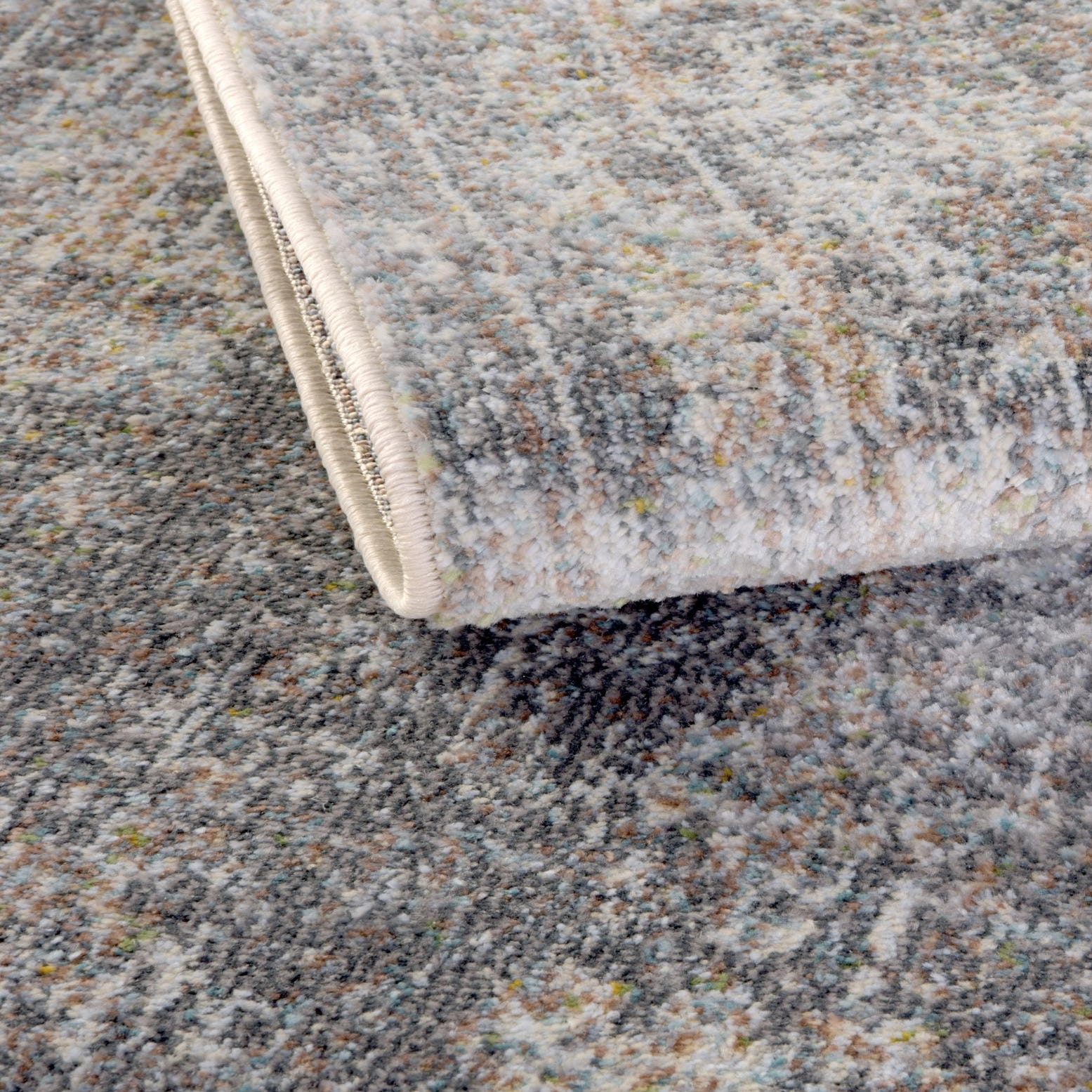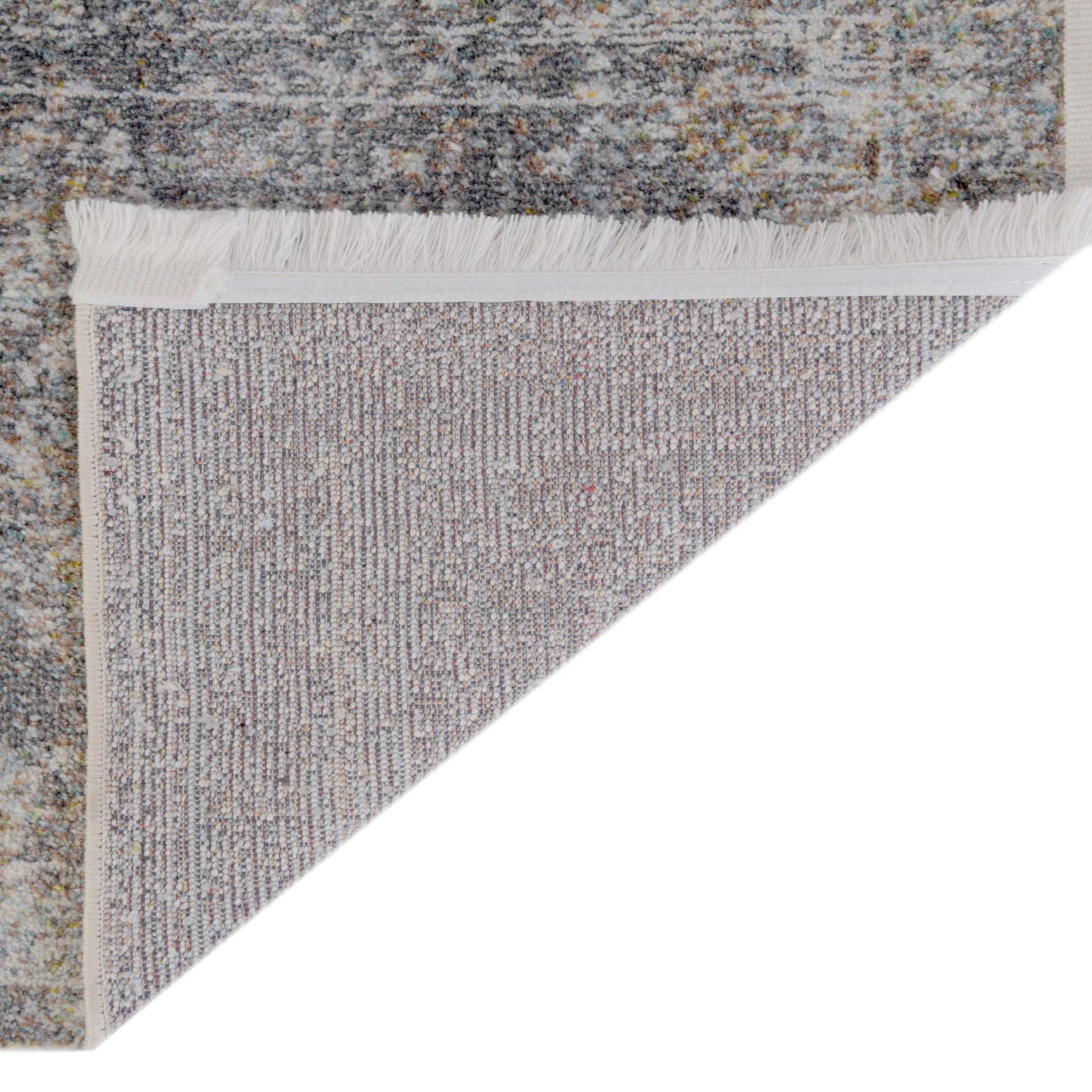 Primary color is Fume Gray. Colors in this rug include: Fume Gray, Brown, Gray, Ivory, Tan, Light Blue.