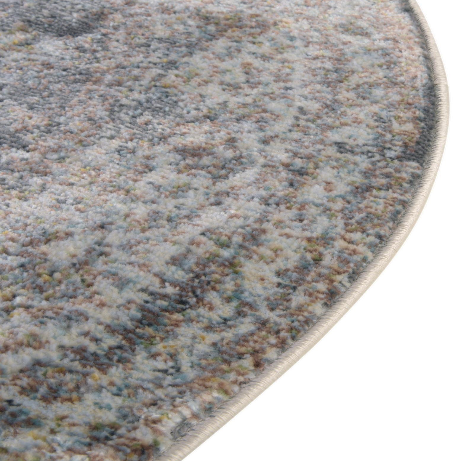 Machine-made from 100% polypropylene, this round rug has a low-profile pile with a smooth, slightly dense feel underfoot. A vintage-inspired, distressed medallion takes center stage against a Fume Gray background, where layered speckles of brown, gray, ivory, tan and light blue create a softly weathered, painterly surface. The circular layout and subtle haloing around the center give the pattern a gentle focal presence while a mottled border blurs the edges for an aged, lived-in look.
