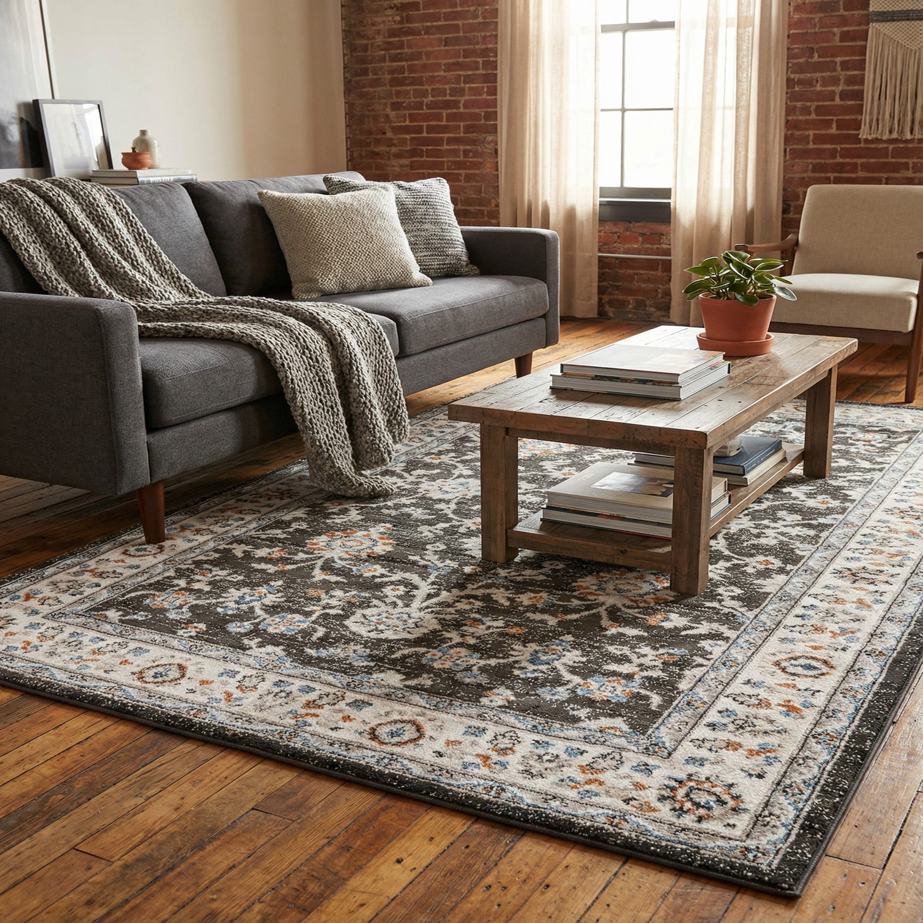 Machine made from 100% polypropylene, the rug offers a soft, slightly cushioned feel underfoot and holds its pattern definition well. Use it to anchor a living room seating area under a coffee table, place it beneath a dining table to balance warm wood tones, or set it in an entryway to introduce layered color without overwhelming the space. Its mix of cool grays and warm terracotta accents pairs naturally with neutral upholstery, leather, linen, and contemporary-traditional or modern farmhouse interiors.
