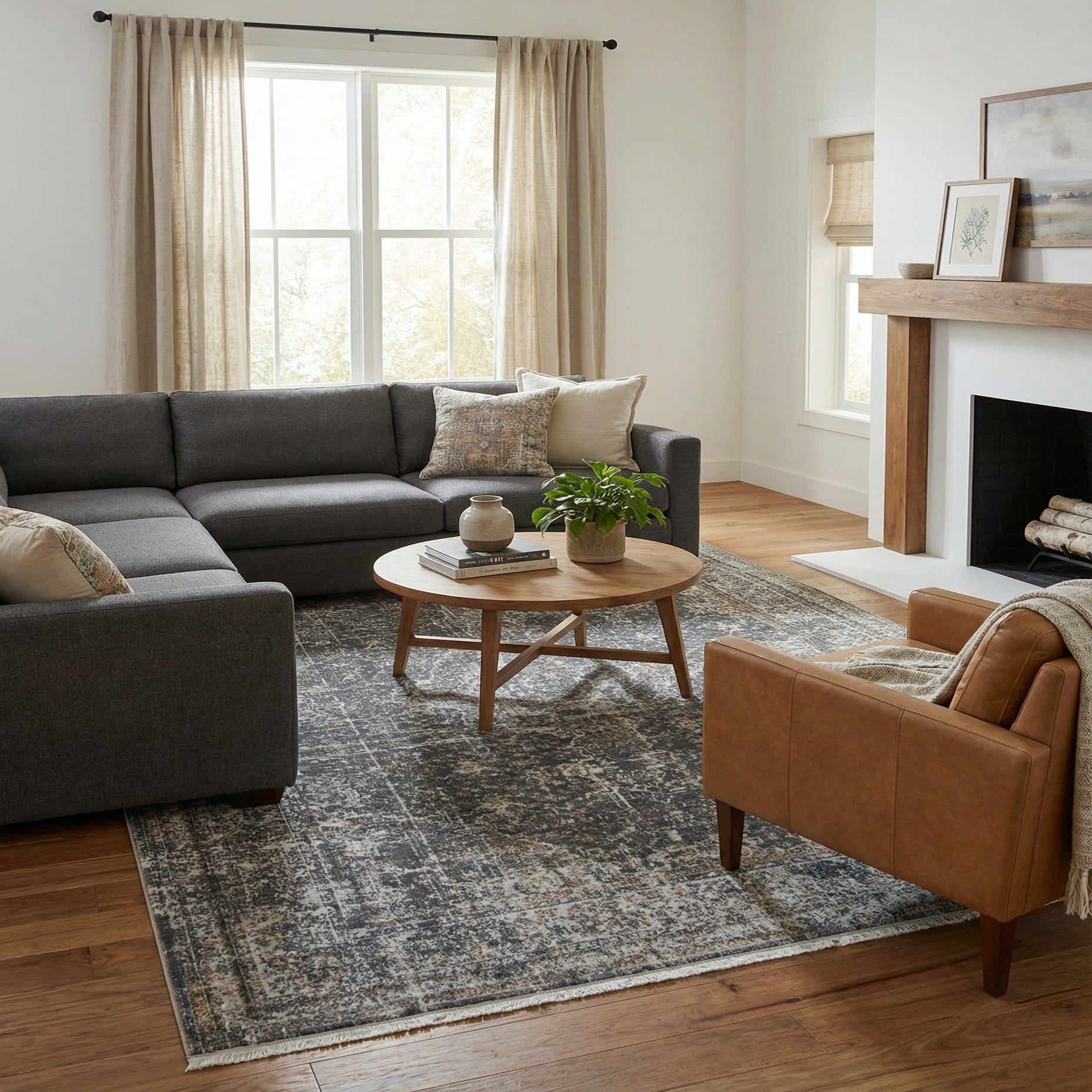 This muted, versatile palette works well in a modern living room to ground seating, under a dining table where pattern adds interest without overpowering, or in a home office to introduce texture and calm. Pair it with warm wood and leather for a transitional style, metal and concrete accents for an industrial edge, or light linens and cool blue accessories for a relaxed coastal-inspired scheme.