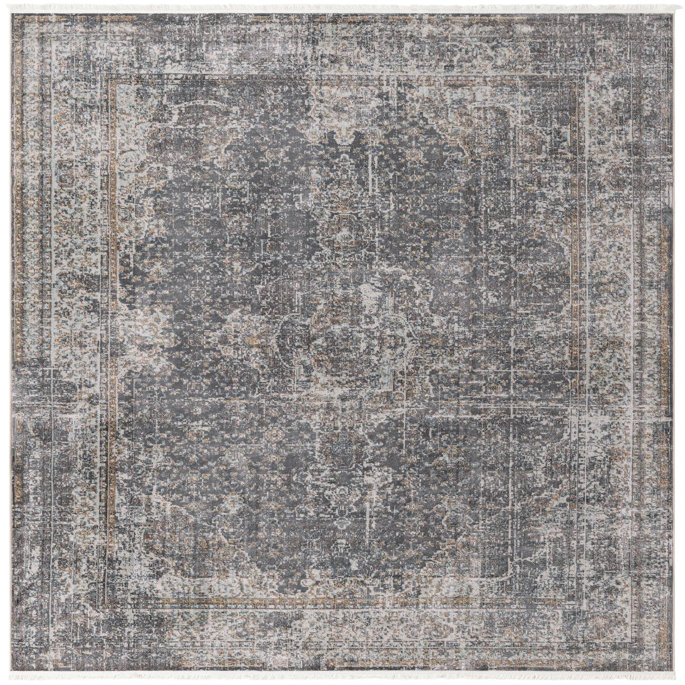 A soft, vintage-inspired pattern rests on a fume gray ground, where a faded medallion and subtle border emerge in layered tones of ivory, light blue, tan, brown, and gray. The distressed motif gives the rug an aged, timeworn character without heavy contrast, so the palette reads calm and cohesive across the surface. Machine-made from 100% polypropylene, the weave creates a low-profile pile with a smooth, slightly plush hand that feels comfortable underfoot and carries a gentle, muted sheen.