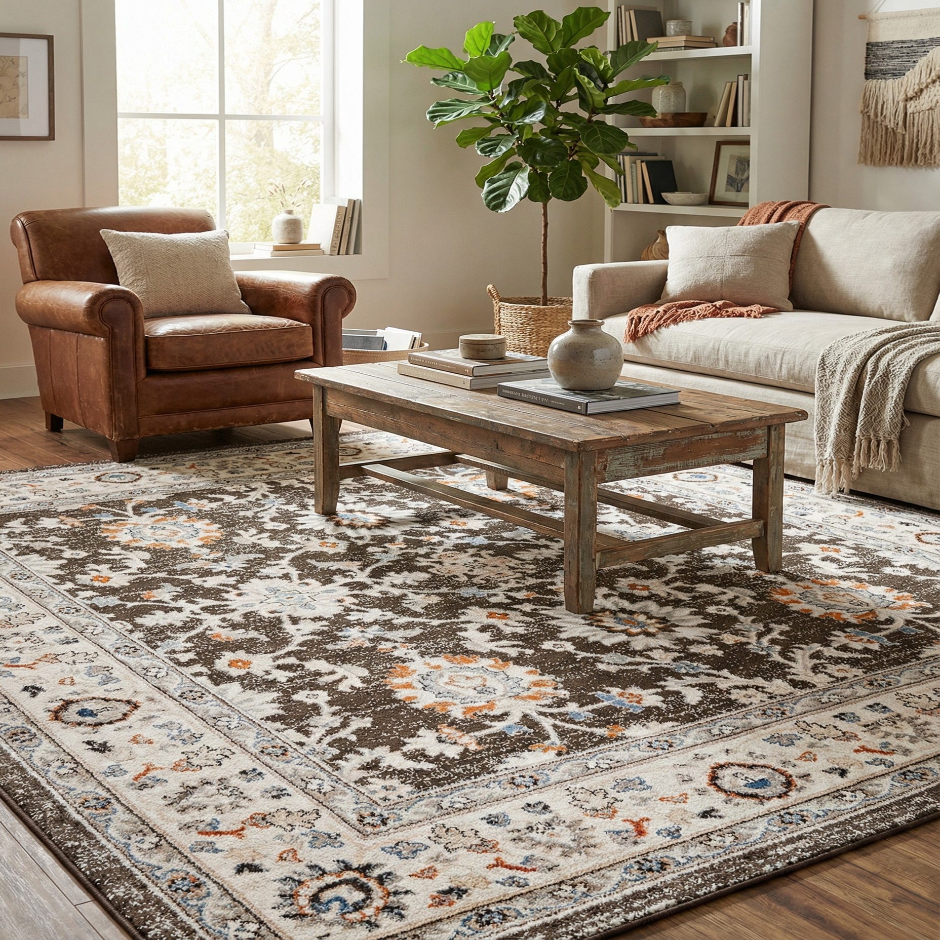 This rug pairs well with transitional and traditional interiors, especially rooms that mix warm wood tones and neutral upholstery. It can anchor a living area beneath seating to bring pattern and color without overwhelming the space, serve under a dining table to add definition, or sit at the foot of a bed to introduce layered texture and warmth. It also complements farmhouse or modern-classic schemes when combined with linen fabrics, leather accents, or matte metal lighting.