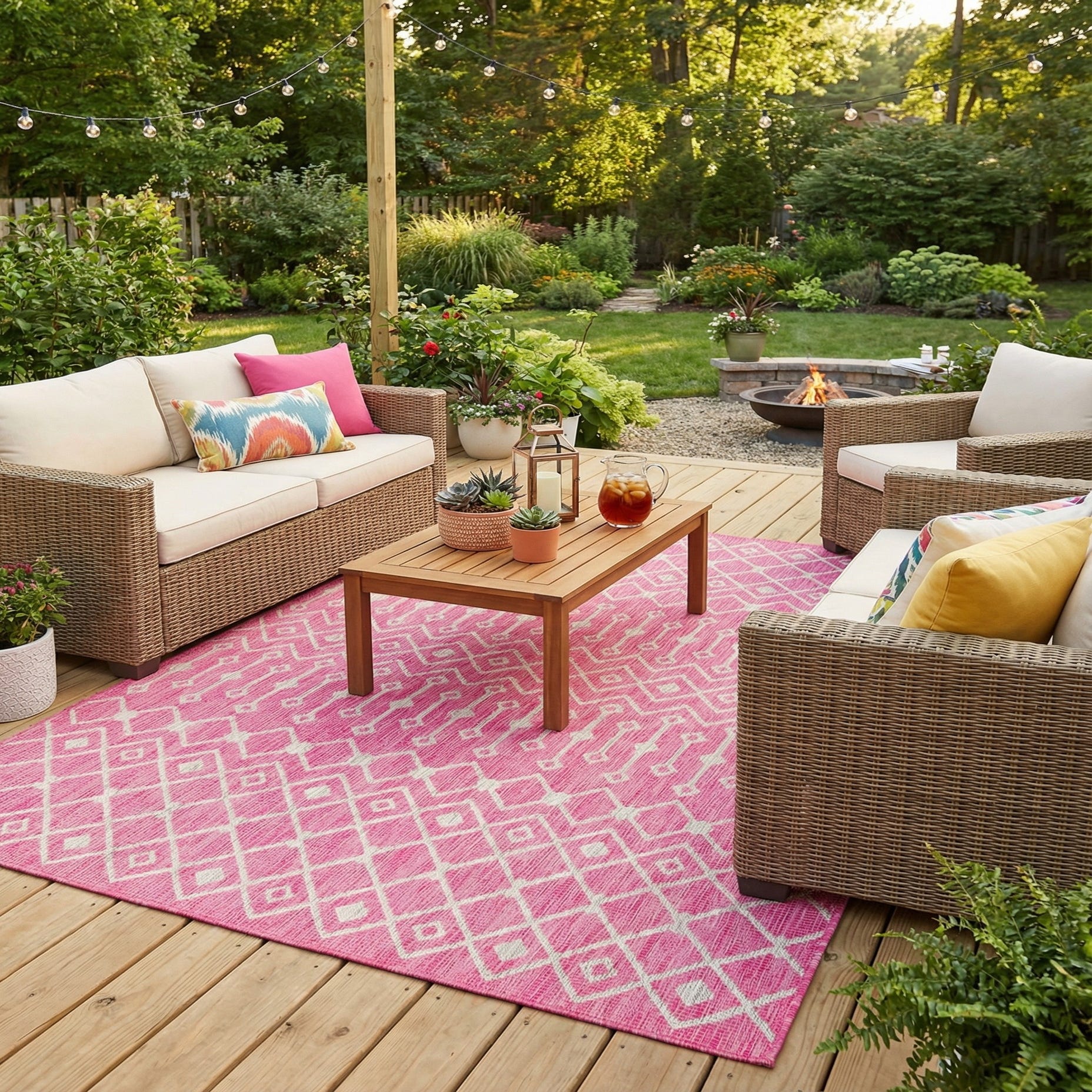 This rug works well on a covered patio or sunroom where color makes a statement alongside neutral furniture, or layered beneath a light wicker seating group to add contrast and energy. It also pairs nicely with gray or white sofas in a modern living room, colorful children’s play areas, or an entryway that benefits from a lively focal point.