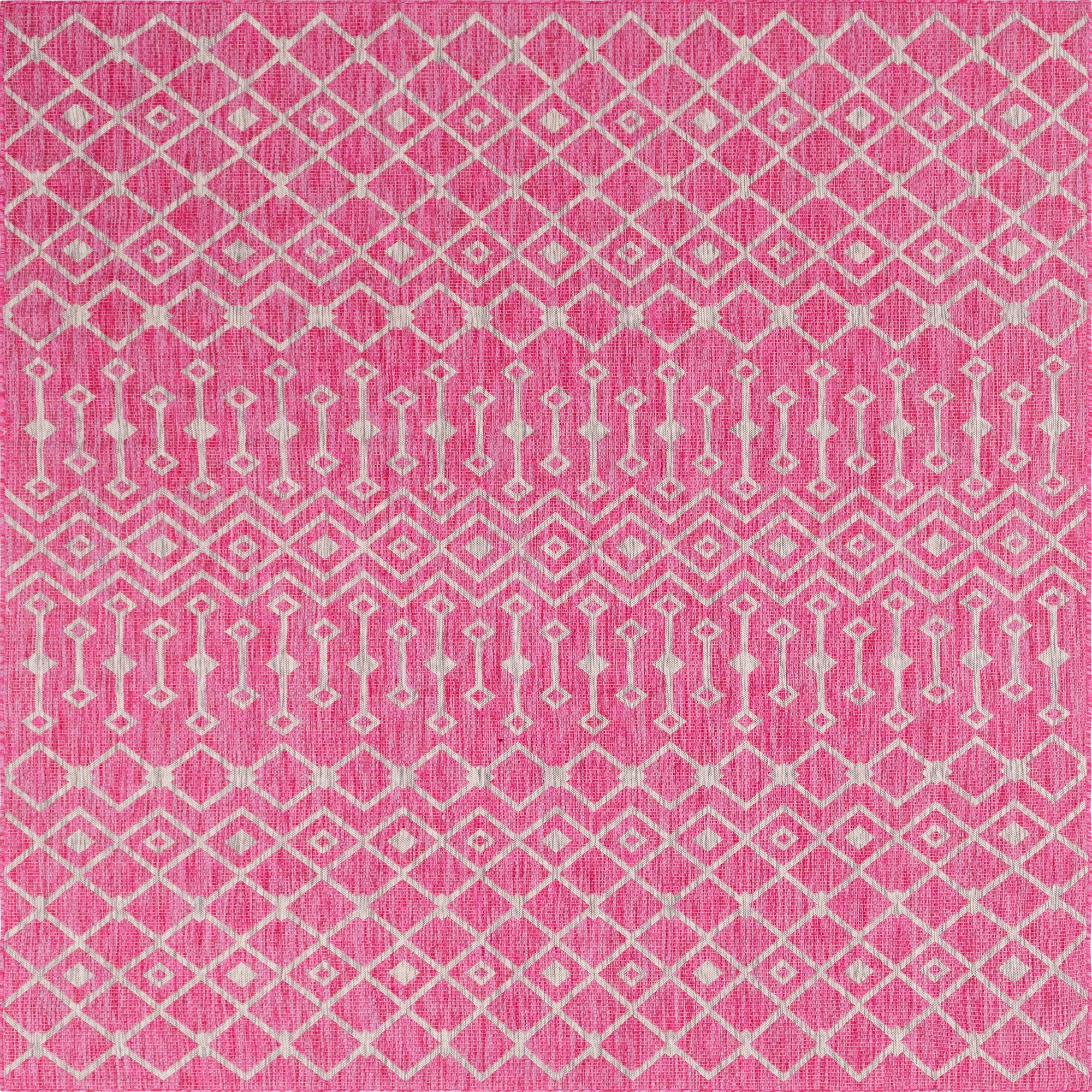 A vibrant 8x11 fuschia rectangular rug with a repeating white tribal geometric pattern, suitable for indoor or outdoor use.