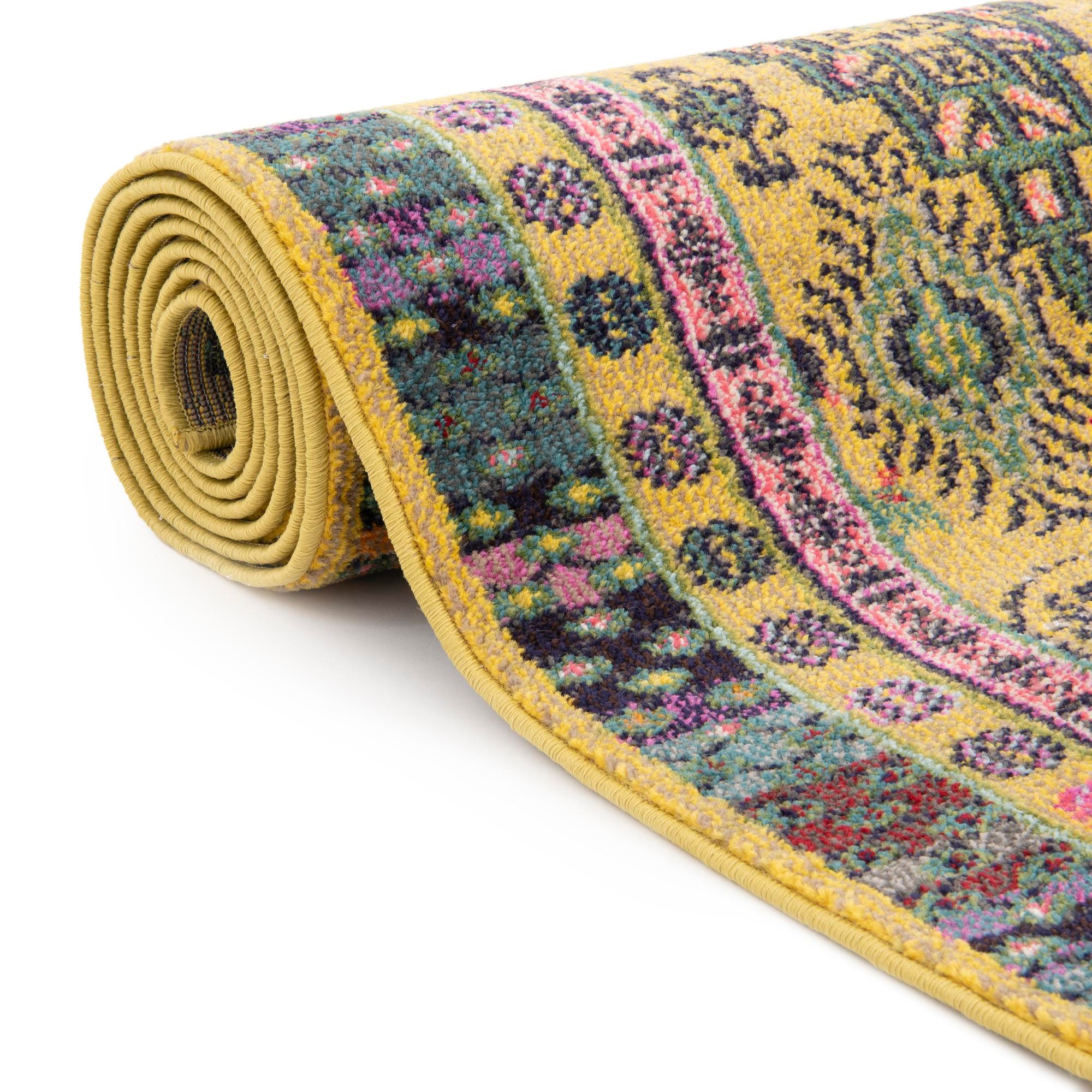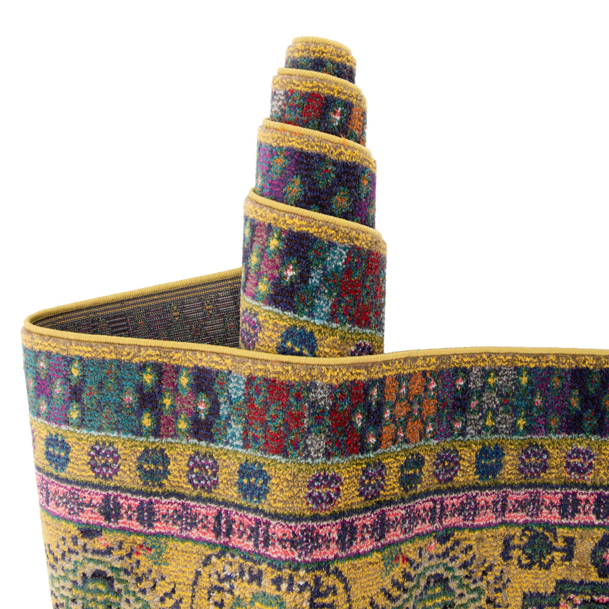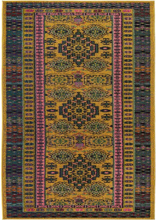 Primary color is Gold. Colors in this rug include: Gold, Blue, Green, Navy Blue, Purple, Red, Pink.