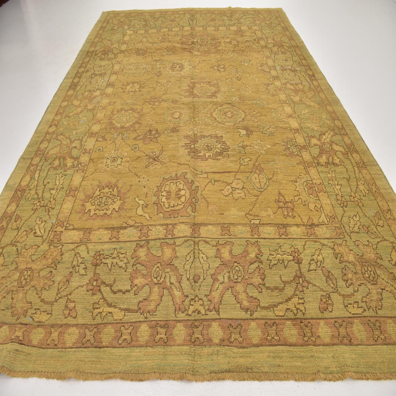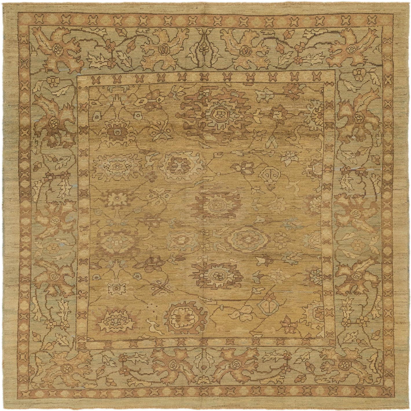 A 10x13 rectangular Oushak rug in yellows and golds with a traditional floral and tribal pattern, handmade from wool.